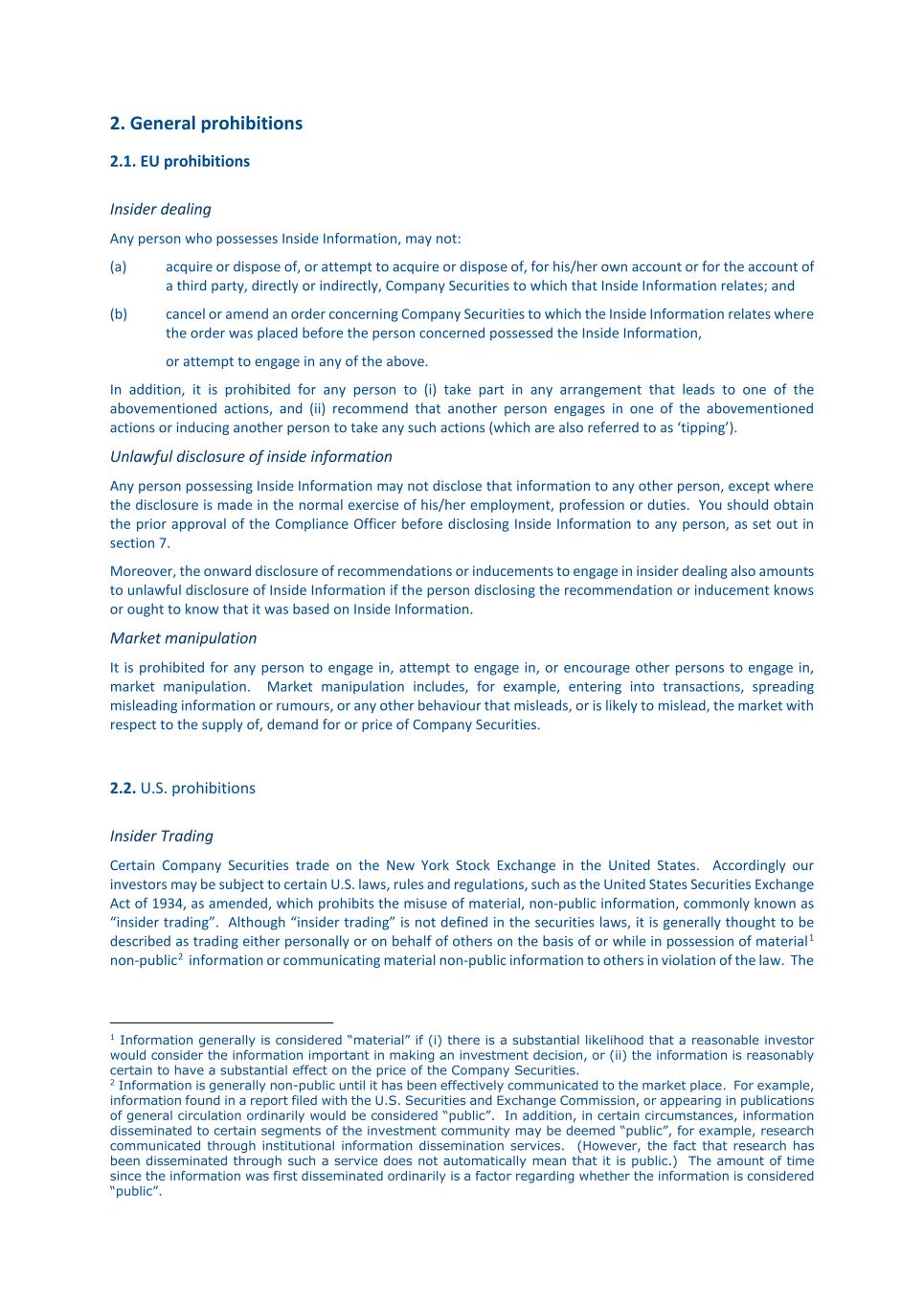 2. General prohibitions 2.1. EU prohibitions Insider dealing Any person who possesses Inside Information, may not: (a) acquire or dispose of, or attempt to acquire or dispose of, for his/her own account or for the account of a third party, directly or indirectly, Company Securities to which that Inside Information relates; and (b) cancel or amend an order concerning Company Securities to which the Inside Information relates where the order was placed before the person concerned possessed the Inside Information, or attempt to engage in any of the above. In addition, it is prohibited for any person to (i) take part in any arrangement that leads to one of the abovementioned actions, and (ii) recommend that another person engages in one of the abovementioned actions or inducing another person to take any such actions (which are also referred to as ‘tipping’). Unlawful disclosure of inside information Any person possessing Inside Information may not disclose that information to any other person, except where the disclosure is made in the normal exercise of his/her employment, profession or duties. You should obtain the prior approval of the Compliance Officer before disclosing Inside Information to any person, as set out in section 7. Moreover, the onward disclosure of recommendations or inducements to engage in insider dealing also amounts to unlawful disclosure of Inside Information if the person disclosing the recommendation or inducement knows or ought to know that it was based on Inside Information. Market manipulation It is prohibited for any person to engage in, attempt to engage in, or encourage other persons to engage in, market manipulation. Market manipulation includes, for example, entering into transactions, spreading misleading information or rumours, or any other behaviour that misleads, or is likely to mislead, the market with respect to the supply of, demand for or price of Company Securities. 2.2. U.S. prohibitions Insider Trading Certain Company Securities trade on the New York Stock Exchange in the United States. Accordingly our investors may be subject to certain U.S. laws, rules and regulations, such as the United States Securities Exchange Act of 1934, as amended, which prohibits the misuse of material, non-public information, commonly known as “insider trading”. Although “insider trading” is not defined in the securities laws, it is generally thought to be described as trading either personally or on behalf of others on the basis of or while in possession of material1 non-public2 information or communicating material non-public information to others in violation of the law. The 1 Information generally is considered “material” if (i) there is a substantial likelihood that a reasonable investor would consider the information important in making an investment decision, or (ii) the information is reasonably certain to have a substantial effect on the price of the Company Securities. 2 Information is generally non-public until it has been effectively communicated to the market place. For example, information found in a report filed with the U.S. Securities and Exchange Commission, or appearing in publications of general circulation ordinarily would be considered “public”. In addition, in certain circumstances, information disseminated to certain segments of the investment community may be deemed “public”, for example, research communicated through institutional information dissemination services. (However, the fact that research has been disseminated through such a service does not automatically mean that it is public.) The amount of time since the information was first disseminated ordinarily is a factor regarding whether the information is considered “public”.