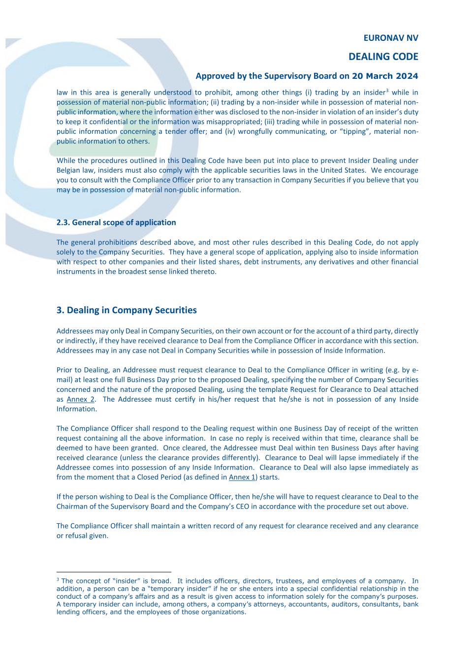 EURONAV NV DEALING CODE Approved by the Supervisory Board on 20 March 2024 law in this area is generally understood to prohibit, among other things (i) trading by an insider3 while in possession of material non-public information; (ii) trading by a non-insider while in possession of material non- public information, where the information either was disclosed to the non-insider in violation of an insider’s duty to keep it confidential or the information was misappropriated; (iii) trading while in possession of material non- public information concerning a tender offer; and (iv) wrongfully communicating, or “tipping”, material non- public information to others. While the procedures outlined in this Dealing Code have been put into place to prevent Insider Dealing under Belgian law, insiders must also comply with the applicable securities laws in the United States. We encourage you to consult with the Compliance Officer prior to any transaction in Company Securities if you believe that you may be in possession of material non-public information. 2.3. General scope of application The general prohibitions described above, and most other rules described in this Dealing Code, do not apply solely to the Company Securities. They have a general scope of application, applying also to inside information with respect to other companies and their listed shares, debt instruments, any derivatives and other financial instruments in the broadest sense linked thereto. 3. Dealing in Company Securities Addressees may only Deal in Company Securities, on their own account or for the account of a third party, directly or indirectly, if they have received clearance to Deal from the Compliance Officer in accordance with this section. Addressees may in any case not Deal in Company Securities while in possession of Inside Information. Prior to Dealing, an Addressee must request clearance to Deal to the Compliance Officer in writing (e.g. by e- mail) at least one full Business Day prior to the proposed Dealing, specifying the number of Company Securities concerned and the nature of the proposed Dealing, using the template Request for Clearance to Deal attached as Annex 2. The Addressee must certify in his/her request that he/she is not in possession of any Inside Information. The Compliance Officer shall respond to the Dealing request within one Business Day of receipt of the written request containing all the above information. In case no reply is received within that time, clearance shall be deemed to have been granted. Once cleared, the Addressee must Deal within ten Business Days after having received clearance (unless the clearance provides differently). Clearance to Deal will lapse immediately if the Addressee comes into possession of any Inside Information. Clearance to Deal will also lapse immediately as from the moment that a Closed Period (as defined in Annex 1) starts. If the person wishing to Deal is the Compliance Officer, then he/she will have to request clearance to Deal to the Chairman of the Supervisory Board and the Company’s CEO in accordance with the procedure set out above. The Compliance Officer shall maintain a written record of any request for clearance received and any clearance or refusal given. 3 The concept of “insider” is broad. It includes officers, directors, trustees, and employees of a company. In addition, a person can be a “temporary insider” if he or she enters into a special confidential relationship in the conduct of a company’s affairs and as a result is given access to information solely for the company’s purposes. A temporary insider can include, among others, a company’s attorneys, accountants, auditors, consultants, bank lending officers, and the employees of those organizations.