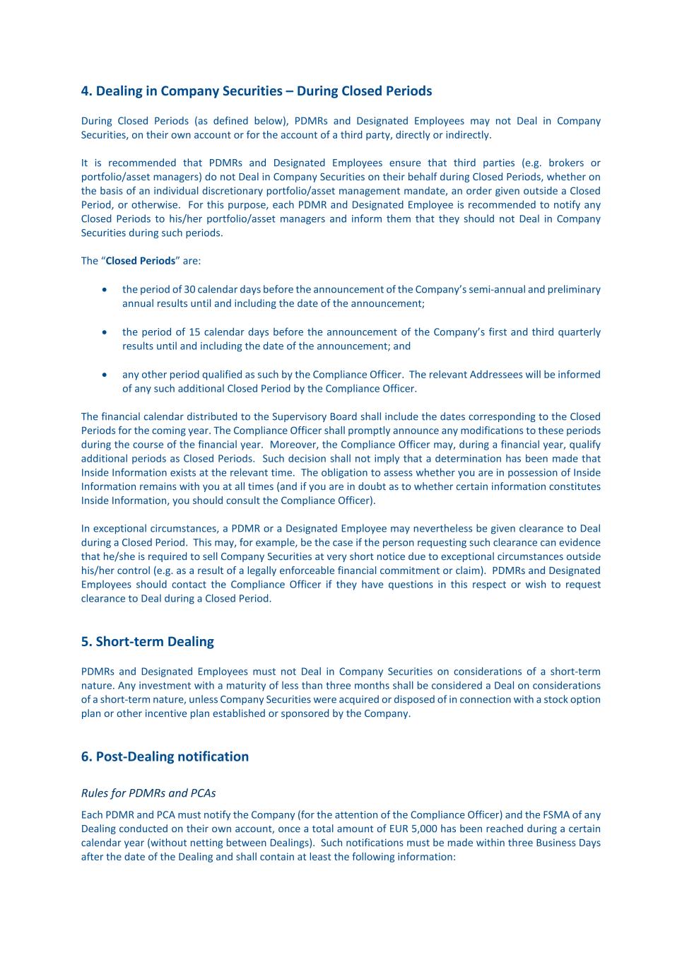 4. Dealing in Company Securities – During Closed Periods During Closed Periods (as defined below), PDMRs and Designated Employees may not Deal in Company Securities, on their own account or for the account of a third party, directly or indirectly. It is recommended that PDMRs and Designated Employees ensure that third parties (e.g. brokers or portfolio/asset managers) do not Deal in Company Securities on their behalf during Closed Periods, whether on the basis of an individual discretionary portfolio/asset management mandate, an order given outside a Closed Period, or otherwise. For this purpose, each PDMR and Designated Employee is recommended to notify any Closed Periods to his/her portfolio/asset managers and inform them that they should not Deal in Company Securities during such periods. The “Closed Periods” are: • the period of 30 calendar days before the announcement of the Company’s semi-annual and preliminary annual results until and including the date of the announcement; • the period of 15 calendar days before the announcement of the Company’s first and third quarterly results until and including the date of the announcement; and • any other period qualified as such by the Compliance Officer. The relevant Addressees will be informed of any such additional Closed Period by the Compliance Officer. The financial calendar distributed to the Supervisory Board shall include the dates corresponding to the Closed Periods for the coming year. The Compliance Officer shall promptly announce any modifications to these periods during the course of the financial year. Moreover, the Compliance Officer may, during a financial year, qualify additional periods as Closed Periods. Such decision shall not imply that a determination has been made that Inside Information exists at the relevant time. The obligation to assess whether you are in possession of Inside Information remains with you at all times (and if you are in doubt as to whether certain information constitutes Inside Information, you should consult the Compliance Officer). In exceptional circumstances, a PDMR or a Designated Employee may nevertheless be given clearance to Deal during a Closed Period. This may, for example, be the case if the person requesting such clearance can evidence that he/she is required to sell Company Securities at very short notice due to exceptional circumstances outside his/her control (e.g. as a result of a legally enforceable financial commitment or claim). PDMRs and Designated Employees should contact the Compliance Officer if they have questions in this respect or wish to request clearance to Deal during a Closed Period. 5. Short-term Dealing PDMRs and Designated Employees must not Deal in Company Securities on considerations of a short-term nature. Any investment with a maturity of less than three months shall be considered a Deal on considerations of a short-term nature, unless Company Securities were acquired or disposed of in connection with a stock option plan or other incentive plan established or sponsored by the Company. 6. Post-Dealing notification Rules for PDMRs and PCAs Each PDMR and PCA must notify the Company (for the attention of the Compliance Officer) and the FSMA of any Dealing conducted on their own account, once a total amount of EUR 5,000 has been reached during a certain calendar year (without netting between Dealings). Such notifications must be made within three Business Days after the date of the Dealing and shall contain at least the following information: