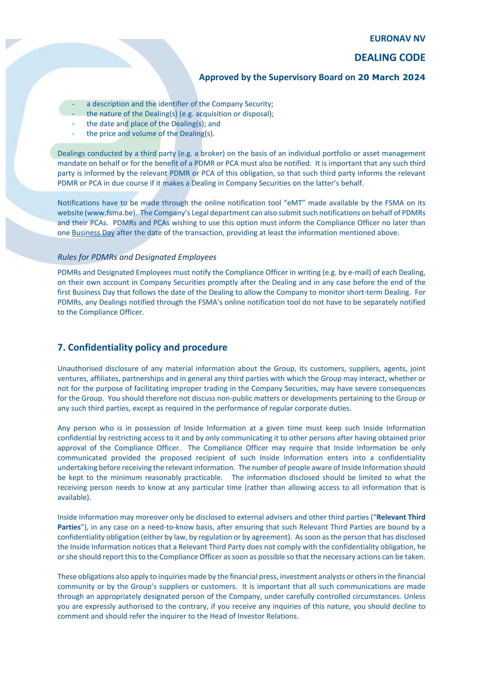 EURONAV NV DEALING CODE Approved by the Supervisory Board on 20 March 2024 - a description and the identifier of the Company Security; - the nature of the Dealing(s) (e.g. acquisition or disposal); - the date and place of the Dealing(s); and - the price and volume of the Dealing(s). Dealings conducted by a third party (e.g. a broker) on the basis of an individual portfolio or asset management mandate on behalf or for the benefit of a PDMR or PCA must also be notified. It is important that any such third party is informed by the relevant PDMR or PCA of this obligation, so that such third party informs the relevant PDMR or PCA in due course if it makes a Dealing in Company Securities on the latter’s behalf. Notifications have to be made through the online notification tool “eMT” made available by the FSMA on its website (www.fsma.be). The Company’s Legal department can also submit such notifications on behalf of PDMRs and their PCAs. PDMRs and PCAs wishing to use this option must inform the Compliance Officer no later than one Business Day after the date of the transaction, providing at least the information mentioned above. Rules for PDMRs and Designated Employees PDMRs and Designated Employees must notify the Compliance Officer in writing (e.g. by e-mail) of each Dealing, on their own account in Company Securities promptly after the Dealing and in any case before the end of the first Business Day that follows the date of the Dealing to allow the Company to monitor short-term Dealing. For PDMRs, any Dealings notified through the FSMA’s online notification tool do not have to be separately notified to the Compliance Officer. 7. Confidentiality policy and procedure Unauthorised disclosure of any material information about the Group, its customers, suppliers, agents, joint ventures, affiliates, partnerships and in general any third parties with which the Group may interact, whether or not for the purpose of facilitating improper trading in the Company Securities, may have severe consequences for the Group. You should therefore not discuss non-public matters or developments pertaining to the Group or any such third parties, except as required in the performance of regular corporate duties. Any person who is in possession of Inside Information at a given time must keep such Inside Information confidential by restricting access to it and by only communicating it to other persons after having obtained prior approval of the Compliance Officer. The Compliance Officer may require that Inside Information be only communicated provided the proposed recipient of such Inside Information enters into a confidentiality undertaking before receiving the relevant information. The number of people aware of Inside Information should be kept to the minimum reasonably practicable. The information disclosed should be limited to what the receiving person needs to know at any particular time (rather than allowing access to all information that is available). Inside Information may moreover only be disclosed to external advisers and other third parties (“Relevant Third Parties”), in any case on a need-to-know basis, after ensuring that such Relevant Third Parties are bound by a confidentiality obligation (either by law, by regulation or by agreement). As soon as the person that has disclosed the Inside Information notices that a Relevant Third Party does not comply with the confidentiality obligation, he or she should report this to the Compliance Officer as soon as possible so that the necessary actions can be taken. These obligations also apply to inquiries made by the financial press, investment analysts or others in the financial community or by the Group’s suppliers or customers. It is important that all such communications are made through an appropriately designated person of the Company, under carefully controlled circumstances. Unless you are expressly authorised to the contrary, if you receive any inquiries of this nature, you should decline to comment and should refer the inquirer to the Head of Investor Relations.