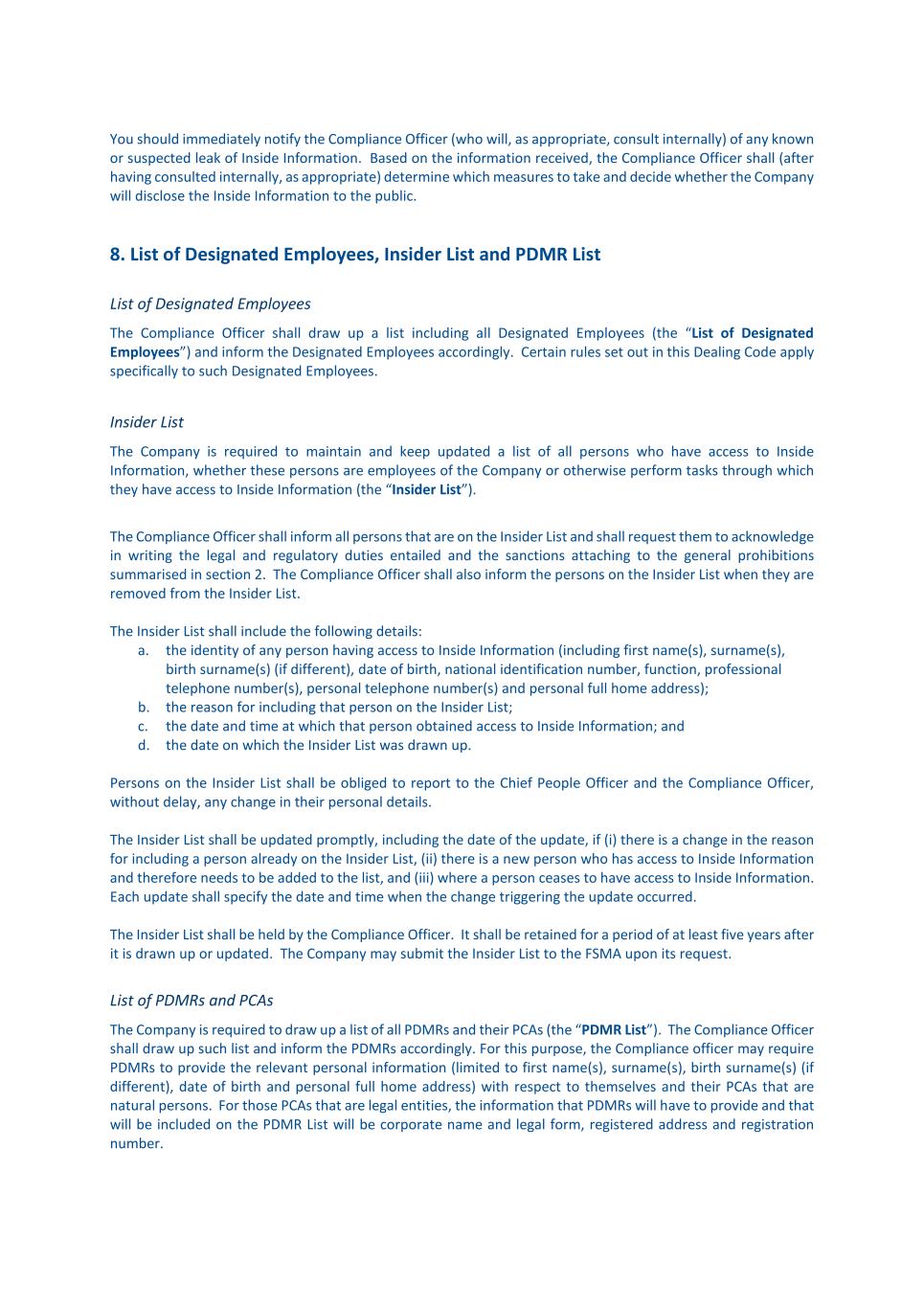 You should immediately notify the Compliance Officer (who will, as appropriate, consult internally) of any known or suspected leak of Inside Information. Based on the information received, the Compliance Officer shall (after having consulted internally, as appropriate) determine which measures to take and decide whether the Company will disclose the Inside Information to the public. 8. List of Designated Employees, Insider List and PDMR List List of Designated Employees The Compliance Officer shall draw up a list including all Designated Employees (the “List of Designated Employees”) and inform the Designated Employees accordingly. Certain rules set out in this Dealing Code apply specifically to such Designated Employees. Insider List The Company is required to maintain and keep updated a list of all persons who have access to Inside Information, whether these persons are employees of the Company or otherwise perform tasks through which they have access to Inside Information (the “Insider List”). The Compliance Officer shall inform all persons that are on the Insider List and shall request them to acknowledge in writing the legal and regulatory duties entailed and the sanctions attaching to the general prohibitions summarised in section 2. The Compliance Officer shall also inform the persons on the Insider List when they are removed from the Insider List. The Insider List shall include the following details: a. the identity of any person having access to Inside Information (including first name(s), surname(s), birth surname(s) (if different), date of birth, national identification number, function, professional telephone number(s), personal telephone number(s) and personal full home address); b. the reason for including that person on the Insider List; c. the date and time at which that person obtained access to Inside Information; and d. the date on which the Insider List was drawn up. Persons on the Insider List shall be obliged to report to the Chief People Officer and the Compliance Officer, without delay, any change in their personal details. The Insider List shall be updated promptly, including the date of the update, if (i) there is a change in the reason for including a person already on the Insider List, (ii) there is a new person who has access to Inside Information and therefore needs to be added to the list, and (iii) where a person ceases to have access to Inside Information. Each update shall specify the date and time when the change triggering the update occurred. The Insider List shall be held by the Compliance Officer. It shall be retained for a period of at least five years after it is drawn up or updated. The Company may submit the Insider List to the FSMA upon its request. List of PDMRs and PCAs The Company is required to draw up a list of all PDMRs and their PCAs (the “PDMR List”). The Compliance Officer shall draw up such list and inform the PDMRs accordingly. For this purpose, the Compliance officer may require PDMRs to provide the relevant personal information (limited to first name(s), surname(s), birth surname(s) (if different), date of birth and personal full home address) with respect to themselves and their PCAs that are natural persons. For those PCAs that are legal entities, the information that PDMRs will have to provide and that will be included on the PDMR List will be corporate name and legal form, registered address and registration number.
