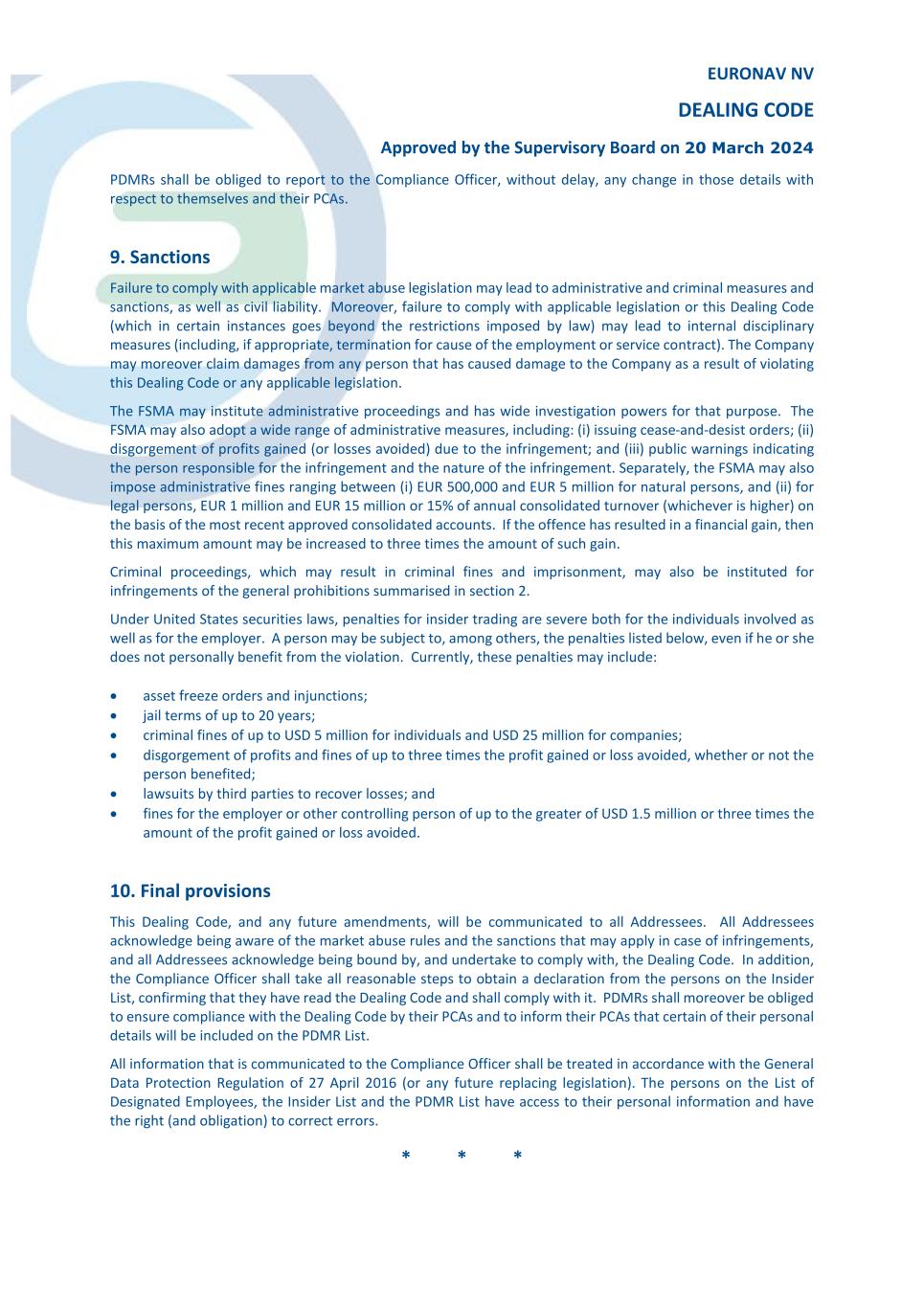 EURONAV NV DEALING CODE Approved by the Supervisory Board on 20 March 2024 PDMRs shall be obliged to report to the Compliance Officer, without delay, any change in those details with respect to themselves and their PCAs. 9. Sanctions Failure to comply with applicable market abuse legislation may lead to administrative and criminal measures and sanctions, as well as civil liability. Moreover, failure to comply with applicable legislation or this Dealing Code (which in certain instances goes beyond the restrictions imposed by law) may lead to internal disciplinary measures (including, if appropriate, termination for cause of the employment or service contract). The Company may moreover claim damages from any person that has caused damage to the Company as a result of violating this Dealing Code or any applicable legislation. The FSMA may institute administrative proceedings and has wide investigation powers for that purpose. The FSMA may also adopt a wide range of administrative measures, including: (i) issuing cease-and-desist orders; (ii) disgorgement of profits gained (or losses avoided) due to the infringement; and (iii) public warnings indicating the person responsible for the infringement and the nature of the infringement. Separately, the FSMA may also impose administrative fines ranging between (i) EUR 500,000 and EUR 5 million for natural persons, and (ii) for legal persons, EUR 1 million and EUR 15 million or 15% of annual consolidated turnover (whichever is higher) on the basis of the most recent approved consolidated accounts. If the offence has resulted in a financial gain, then this maximum amount may be increased to three times the amount of such gain. Criminal proceedings, which may result in criminal fines and imprisonment, may also be instituted for infringements of the general prohibitions summarised in section 2. Under United States securities laws, penalties for insider trading are severe both for the individuals involved as well as for the employer. A person may be subject to, among others, the penalties listed below, even if he or she does not personally benefit from the violation. Currently, these penalties may include: • asset freeze orders and injunctions; • jail terms of up to 20 years; • criminal fines of up to USD 5 million for individuals and USD 25 million for companies; • disgorgement of profits and fines of up to three times the profit gained or loss avoided, whether or not the person benefited; • lawsuits by third parties to recover losses; and • fines for the employer or other controlling person of up to the greater of USD 1.5 million or three times the amount of the profit gained or loss avoided. 10. Final provisions This Dealing Code, and any future amendments, will be communicated to all Addressees. All Addressees acknowledge being aware of the market abuse rules and the sanctions that may apply in case of infringements, and all Addressees acknowledge being bound by, and undertake to comply with, the Dealing Code. In addition, the Compliance Officer shall take all reasonable steps to obtain a declaration from the persons on the Insider List, confirming that they have read the Dealing Code and shall comply with it. PDMRs shall moreover be obliged to ensure compliance with the Dealing Code by their PCAs and to inform their PCAs that certain of their personal details will be included on the PDMR List. All information that is communicated to the Compliance Officer shall be treated in accordance with the General Data Protection Regulation of 27 April 2016 (or any future replacing legislation). The persons on the List of Designated Employees, the Insider List and the PDMR List have access to their personal information and have the right (and obligation) to correct errors. * * *
