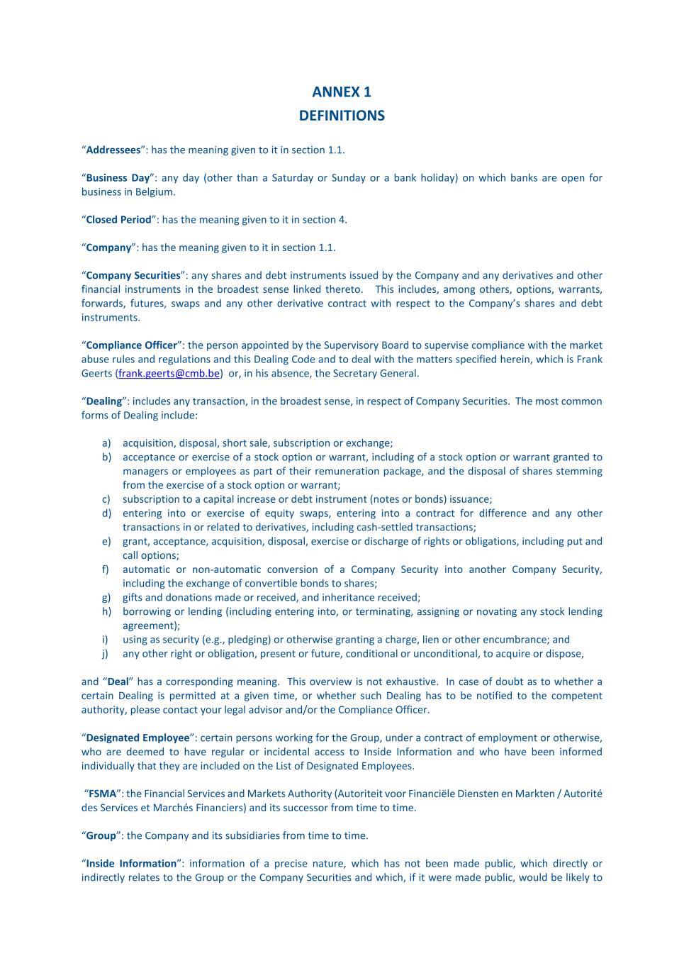ANNEX 1 DEFINITIONS “Addressees”: has the meaning given to it in section 1.1. “Business Day”: any day (other than a Saturday or Sunday or a bank holiday) on which banks are open for business in Belgium. “Closed Period”: has the meaning given to it in section 4. “Company”: has the meaning given to it in section 1.1. “Company Securities”: any shares and debt instruments issued by the Company and any derivatives and other financial instruments in the broadest sense linked thereto. This includes, among others, options, warrants, forwards, futures, swaps and any other derivative contract with respect to the Company’s shares and debt instruments. “Compliance Officer”: the person appointed by the Supervisory Board to supervise compliance with the market abuse rules and regulations and this Dealing Code and to deal with the matters specified herein, which is Frank Geerts (frank.geerts@cmb.be) or, in his absence, the Secretary General. “Dealing”: includes any transaction, in the broadest sense, in respect of Company Securities. The most common forms of Dealing include: a) acquisition, disposal, short sale, subscription or exchange; b) acceptance or exercise of a stock option or warrant, including of a stock option or warrant granted to managers or employees as part of their remuneration package, and the disposal of shares stemming from the exercise of a stock option or warrant; c) subscription to a capital increase or debt instrument (notes or bonds) issuance; d) entering into or exercise of equity swaps, entering into a contract for difference and any other transactions in or related to derivatives, including cash-settled transactions; e) grant, acceptance, acquisition, disposal, exercise or discharge of rights or obligations, including put and call options; f) automatic or non-automatic conversion of a Company Security into another Company Security, including the exchange of convertible bonds to shares; g) gifts and donations made or received, and inheritance received; h) borrowing or lending (including entering into, or terminating, assigning or novating any stock lending agreement); i) using as security (e.g., pledging) or otherwise granting a charge, lien or other encumbrance; and j) any other right or obligation, present or future, conditional or unconditional, to acquire or dispose, and “Deal” has a corresponding meaning. This overview is not exhaustive. In case of doubt as to whether a certain Dealing is permitted at a given time, or whether such Dealing has to be notified to the competent authority, please contact your legal advisor and/or the Compliance Officer. “Designated Employee”: certain persons working for the Group, under a contract of employment or otherwise, who are deemed to have regular or incidental access to Inside Information and who have been informed individually that they are included on the List of Designated Employees. “FSMA”: the Financial Services and Markets Authority (Autoriteit voor Financiële Diensten en Markten / Autorité des Services et Marchés Financiers) and its successor from time to time. “Group”: the Company and its subsidiaries from time to time. “Inside Information”: information of a precise nature, which has not been made public, which directly or indirectly relates to the Group or the Company Securities and which, if it were made public, would be likely to