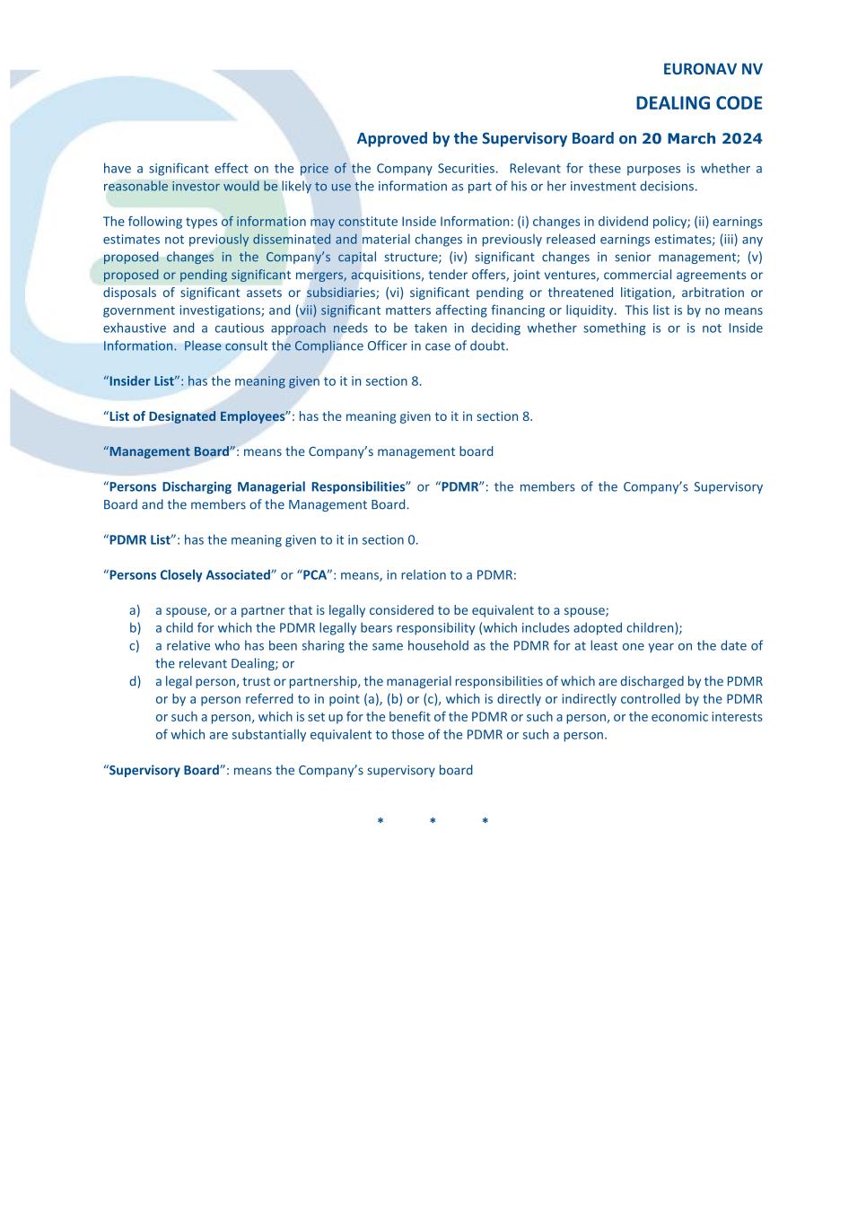 EURONAV NV DEALING CODE Approved by the Supervisory Board on 20 March 2024 have a significant effect on the price of the Company Securities. Relevant for these purposes is whether a reasonable investor would be likely to use the information as part of his or her investment decisions. The following types of information may constitute Inside Information: (i) changes in dividend policy; (ii) earnings estimates not previously disseminated and material changes in previously released earnings estimates; (iii) any proposed changes in the Company’s capital structure; (iv) significant changes in senior management; (v) proposed or pending significant mergers, acquisitions, tender offers, joint ventures, commercial agreements or disposals of significant assets or subsidiaries; (vi) significant pending or threatened litigation, arbitration or government investigations; and (vii) significant matters affecting financing or liquidity. This list is by no means exhaustive and a cautious approach needs to be taken in deciding whether something is or is not Inside Information. Please consult the Compliance Officer in case of doubt. “Insider List”: has the meaning given to it in section 8. “List of Designated Employees”: has the meaning given to it in section 8. “Management Board”: means the Company’s management board “Persons Discharging Managerial Responsibilities” or “PDMR”: the members of the Company’s Supervisory Board and the members of the Management Board. “PDMR List”: has the meaning given to it in section 0. “Persons Closely Associated” or “PCA”: means, in relation to a PDMR: a) a spouse, or a partner that is legally considered to be equivalent to a spouse; b) a child for which the PDMR legally bears responsibility (which includes adopted children); c) a relative who has been sharing the same household as the PDMR for at least one year on the date of the relevant Dealing; or d) a legal person, trust or partnership, the managerial responsibilities of which are discharged by the PDMR or by a person referred to in point (a), (b) or (c), which is directly or indirectly controlled by the PDMR or such a person, which is set up for the benefit of the PDMR or such a person, or the economic interests of which are substantially equivalent to those of the PDMR or such a person. “Supervisory Board”: means the Company’s supervisory board * * *