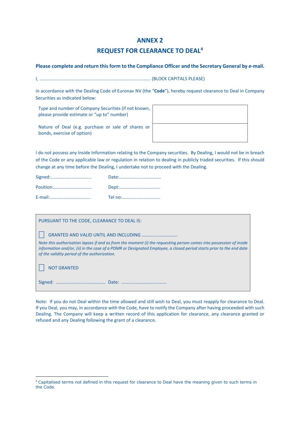 ANNEX 2 REQUEST FOR CLEARANCE TO DEAL4 Please complete and return this form to the Compliance Officer and the Secretary General by e-mail. I, …………………………………………………………………………………… (BLOCK CAPITALS PLEASE) in accordance with the Dealing Code of Euronav NV (the “Code”), hereby request clearance to Deal in Company Securities as indicated below: Type and number of Company Securities (if not known, please provide estimate or “up to” number) Nature of Deal (e.g. purchase or sale of shares or bonds, exercise of option) I do not possess any Inside Information relating to the Company securities. By Dealing, I would not be in breach of the Code or any applicable law or regulation in relation to dealing in publicly traded securities. If this should change at any time before the Dealing, I undertake not to proceed with the Dealing. Signed:…………………………….. Date:……………………………… Position:…………………………… Dept:…………………………….. E-mail:…………………………….. Tel no:…………………………… PURSUANT TO THE CODE, CLEARANCE TO DEAL IS: GRANTED AND VALID UNTIL AND INCLUDING …………………………. Note this authorisation lapses if and as from the moment (i) the requesting person comes into possession of inside information and/or, (ii) in the case of a PDMR or Designated Employee, a closed period starts prior to the end date of the validity period of the authorization. NOT GRANTED Signed: ……………………………………. Date: ………………………………… Note: If you do not Deal within the time allowed and still wish to Deal, you must reapply for clearance to Deal. If you Deal, you may, in accordance with the Code, have to notify the Company after having proceeded with such Dealing. The Company will keep a written record of this application for clearance, any clearance granted or refused and any Dealing following the grant of a clearance. 4 Capitalised terms not defined in this request for clearance to Deal have the meaning given to such terms in the Code.