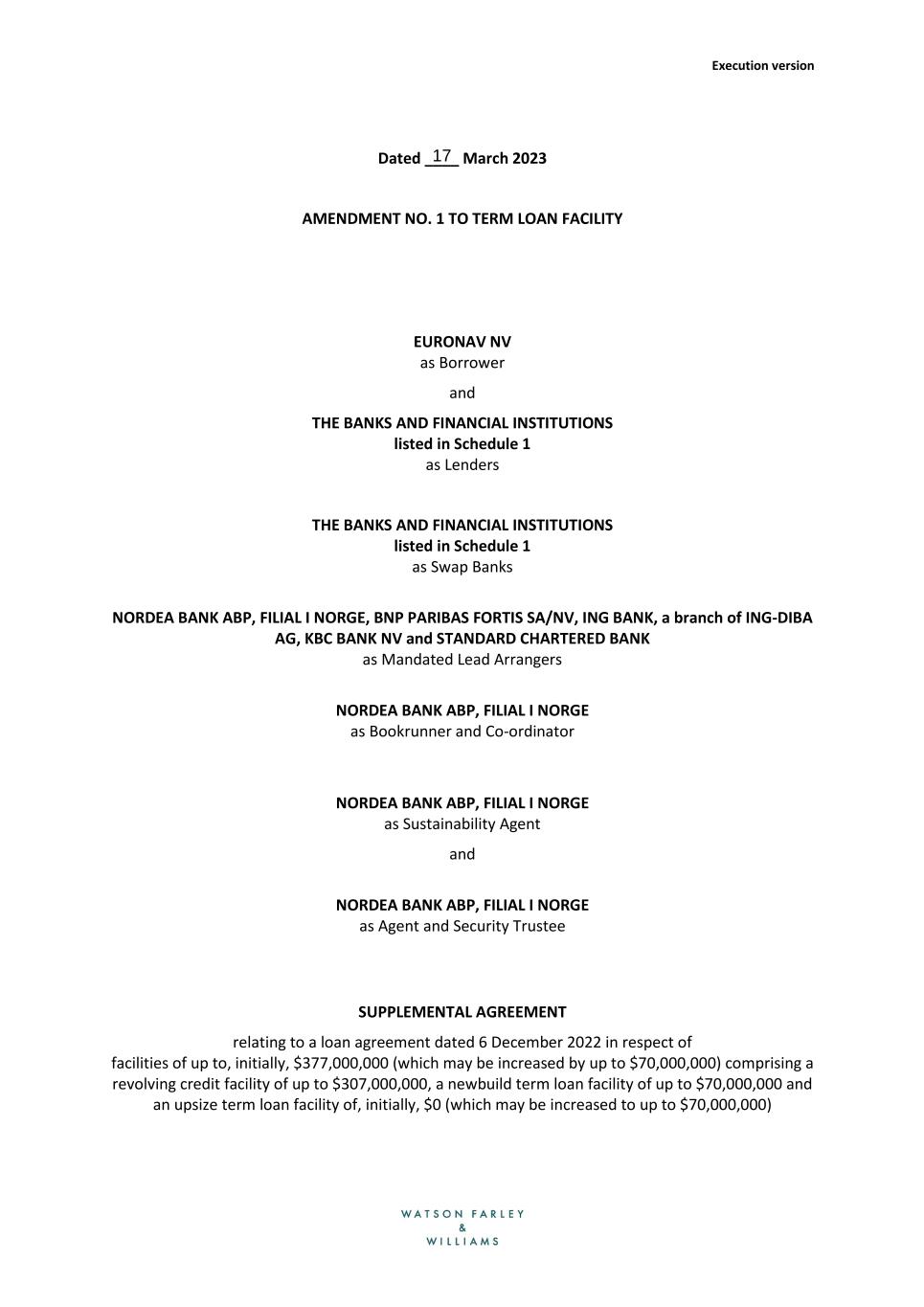 Execution version Dated ____ March 2023 AMENDMENT NO. 1 TO TERM LOAN FACILITY EURONAV NV as Borrower and THE BANKS AND FINANCIAL INSTITUTIONS listed in Schedule 1 as Lenders THE BANKS AND FINANCIAL INSTITUTIONS listed in Schedule 1 as Swap Banks NORDEA BANK ABP, FILIAL I NORGE, BNP PARIBAS FORTIS SA/NV, ING BANK, a branch of ING-DIBA AG, KBC BANK NV and STANDARD CHARTERED BANK as Mandated Lead Arrangers NORDEA BANK ABP, FILIAL I NORGE as Bookrunner and Co-ordinator NORDEA BANK ABP, FILIAL I NORGE as Sustainability Agent and NORDEA BANK ABP, FILIAL I NORGE as Agent and Security Trustee SUPPLEMENTAL AGREEMENT relating to a loan agreement dated 6 December 2022 in respect of facilities of up to, initially, $377,000,000 (which may be increased by up to $70,000,000) comprising a revolving credit facility of up to $307,000,000, a newbuild term loan facility of up to $70,000,000 and an upsize term loan facility of, initially, $0 (which may be increased to up to $70,000,000) 17