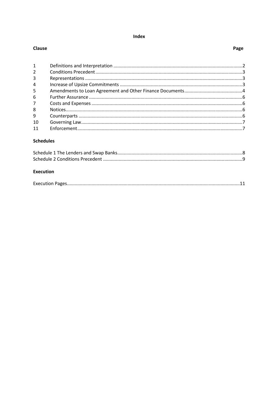 Index Clause Page 1 Definitions and Interpretation .................................................................................................... 2 2 Conditions Precedent .................................................................................................................. 3 3 Representations .......................................................................................................................... 3 4 Increase of Upsize Commitments ............................................................................................... 3 5 Amendments to Loan Agreement and Other Finance Documents ............................................. 4 6 Further Assurance ....................................................................................................................... 6 7 Costs and Expenses ..................................................................................................................... 6 8 Notices ......................................................................................................................................... 6 9 Counterparts ............................................................................................................................... 6 10 Governing Law ............................................................................................................................. 7 11 Enforcement ................................................................................................................................ 7 Schedules Schedule 1 The Lenders and Swap Banks ................................................................................................. 8 Schedule 2 Conditions Precedent ............................................................................................................ 9 Execution Execution Pages ......................................................................................................................................11