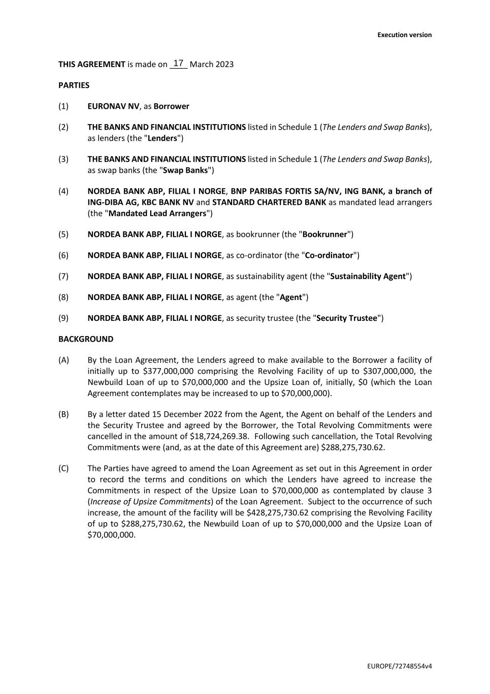 Execution version EUROPE/72748554v4 THIS AGREEMENT is made on ____ March 2023 PARTIES (1) EURONAV NV, as Borrower (2) THE BANKS AND FINANCIAL INSTITUTIONS listed in Schedule 1 (The Lenders and Swap Banks), as lenders (the "Lenders") (3) THE BANKS AND FINANCIAL INSTITUTIONS listed in Schedule 1 (The Lenders and Swap Banks), as swap banks (the "Swap Banks") (4) NORDEA BANK ABP, FILIAL I NORGE, BNP PARIBAS FORTIS SA/NV, ING BANK, a branch of ING-DIBA AG, KBC BANK NV and STANDARD CHARTERED BANK as mandated lead arrangers (the "Mandated Lead Arrangers") (5) NORDEA BANK ABP, FILIAL I NORGE, as bookrunner (the "Bookrunner") (6) NORDEA BANK ABP, FILIAL I NORGE, as co-ordinator (the "Co-ordinator") (7) NORDEA BANK ABP, FILIAL I NORGE, as sustainability agent (the "Sustainability Agent") (8) NORDEA BANK ABP, FILIAL I NORGE, as agent (the "Agent") (9) NORDEA BANK ABP, FILIAL I NORGE, as security trustee (the "Security Trustee") BACKGROUND (A) By the Loan Agreement, the Lenders agreed to make available to the Borrower a facility of initially up to $377,000,000 comprising the Revolving Facility of up to $307,000,000, the Newbuild Loan of up to $70,000,000 and the Upsize Loan of, initially, $0 (which the Loan Agreement contemplates may be increased to up to $70,000,000). (B) By a letter dated 15 December 2022 from the Agent, the Agent on behalf of the Lenders and the Security Trustee and agreed by the Borrower, the Total Revolving Commitments were cancelled in the amount of $18,724,269.38. Following such cancellation, the Total Revolving Commitments were (and, as at the date of this Agreement are) $288,275,730.62. (C) The Parties have agreed to amend the Loan Agreement as set out in this Agreement in order to record the terms and conditions on which the Lenders have agreed to increase the Commitments in respect of the Upsize Loan to $70,000,000 as contemplated by clause 3 (Increase of Upsize Commitments) of the Loan Agreement. Subject to the occurrence of such increase, the amount of the facility will be $428,275,730.62 comprising the Revolving Facility of up to $288,275,730.62, the Newbuild Loan of up to $70,000,000 and the Upsize Loan of $70,000,000. 17