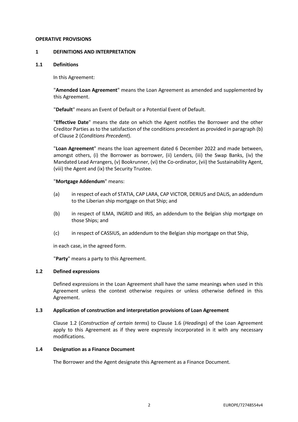 2 EUROPE/72748554v4 OPERATIVE PROVISIONS 1 DEFINITIONS AND INTERPRETATION 1.1 Definitions In this Agreement: "Amended Loan Agreement" means the Loan Agreement as amended and supplemented by this Agreement. "Default" means an Event of Default or a Potential Event of Default. "Effective Date" means the date on which the Agent notifies the Borrower and the other Creditor Parties as to the satisfaction of the conditions precedent as provided in paragraph (b) of Clause 2 (Conditions Precedent). "Loan Agreement" means the loan agreement dated 6 December 2022 and made between, amongst others, (i) the Borrower as borrower, (ii) Lenders, (iii) the Swap Banks, (iv) the Mandated Lead Arrangers, (v) Bookrunner, (vi) the Co-ordinator, (vii) the Sustainability Agent, (viii) the Agent and (ix) the Security Trustee. "Mortgage Addendum" means: (a) in respect of each of STATIA, CAP LARA, CAP VICTOR, DERIUS and DALIS, an addendum to the Liberian ship mortgage on that Ship; and (b) in respect of ILMA, INGRID and IRIS, an addendum to the Belgian ship mortgage on those Ships; and (c) in respect of CASSIUS, an addendum to the Belgian ship mortgage on that Ship, in each case, in the agreed form. "Party" means a party to this Agreement. 1.2 Defined expressions Defined expressions in the Loan Agreement shall have the same meanings when used in this Agreement unless the context otherwise requires or unless otherwise defined in this Agreement. 1.3 Application of construction and interpretation provisions of Loan Agreement Clause 1.2 (Construction of certain terms) to Clause 1.6 (Headings) of the Loan Agreement apply to this Agreement as if they were expressly incorporated in it with any necessary modifications. 1.4 Designation as a Finance Document The Borrower and the Agent designate this Agreement as a Finance Document.