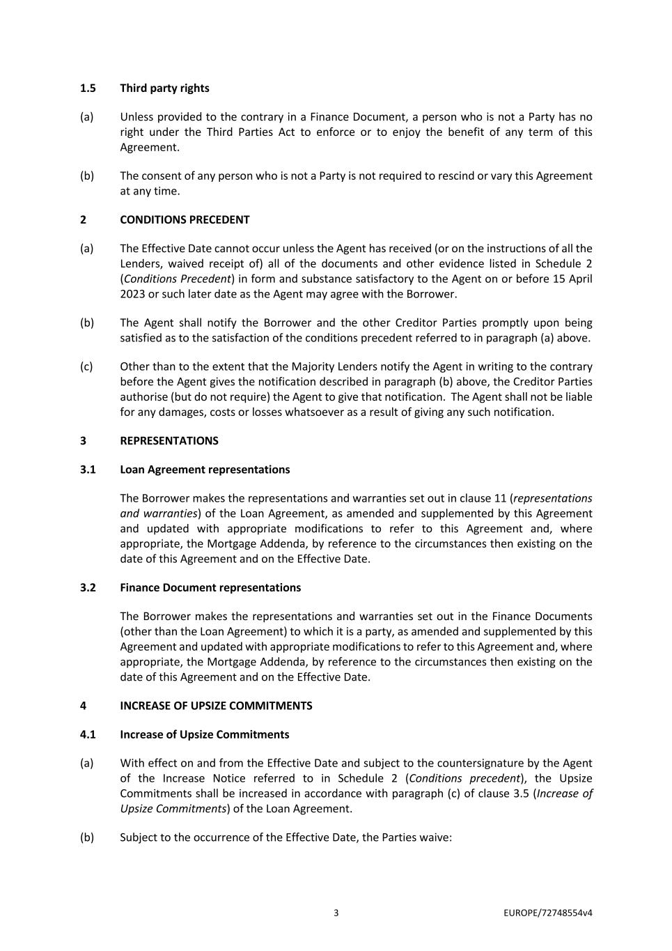 3 EUROPE/72748554v4 1.5 Third party rights (a) Unless provided to the contrary in a Finance Document, a person who is not a Party has no right under the Third Parties Act to enforce or to enjoy the benefit of any term of this Agreement. (b) The consent of any person who is not a Party is not required to rescind or vary this Agreement at any time. 2 CONDITIONS PRECEDENT (a) The Effective Date cannot occur unless the Agent has received (or on the instructions of all the Lenders, waived receipt of) all of the documents and other evidence listed in Schedule 2 (Conditions Precedent) in form and substance satisfactory to the Agent on or before 15 April 2023 or such later date as the Agent may agree with the Borrower. (b) The Agent shall notify the Borrower and the other Creditor Parties promptly upon being satisfied as to the satisfaction of the conditions precedent referred to in paragraph (a) above. (c) Other than to the extent that the Majority Lenders notify the Agent in writing to the contrary before the Agent gives the notification described in paragraph (b) above, the Creditor Parties authorise (but do not require) the Agent to give that notification. The Agent shall not be liable for any damages, costs or losses whatsoever as a result of giving any such notification. 3 REPRESENTATIONS 3.1 Loan Agreement representations The Borrower makes the representations and warranties set out in clause 11 (representations and warranties) of the Loan Agreement, as amended and supplemented by this Agreement and updated with appropriate modifications to refer to this Agreement and, where appropriate, the Mortgage Addenda, by reference to the circumstances then existing on the date of this Agreement and on the Effective Date. 3.2 Finance Document representations The Borrower makes the representations and warranties set out in the Finance Documents (other than the Loan Agreement) to which it is a party, as amended and supplemented by this Agreement and updated with appropriate modifications to refer to this Agreement and, where appropriate, the Mortgage Addenda, by reference to the circumstances then existing on the date of this Agreement and on the Effective Date. 4 INCREASE OF UPSIZE COMMITMENTS 4.1 Increase of Upsize Commitments (a) With effect on and from the Effective Date and subject to the countersignature by the Agent of the Increase Notice referred to in Schedule 2 (Conditions precedent), the Upsize Commitments shall be increased in accordance with paragraph (c) of clause 3.5 (Increase of Upsize Commitments) of the Loan Agreement. (b) Subject to the occurrence of the Effective Date, the Parties waive: