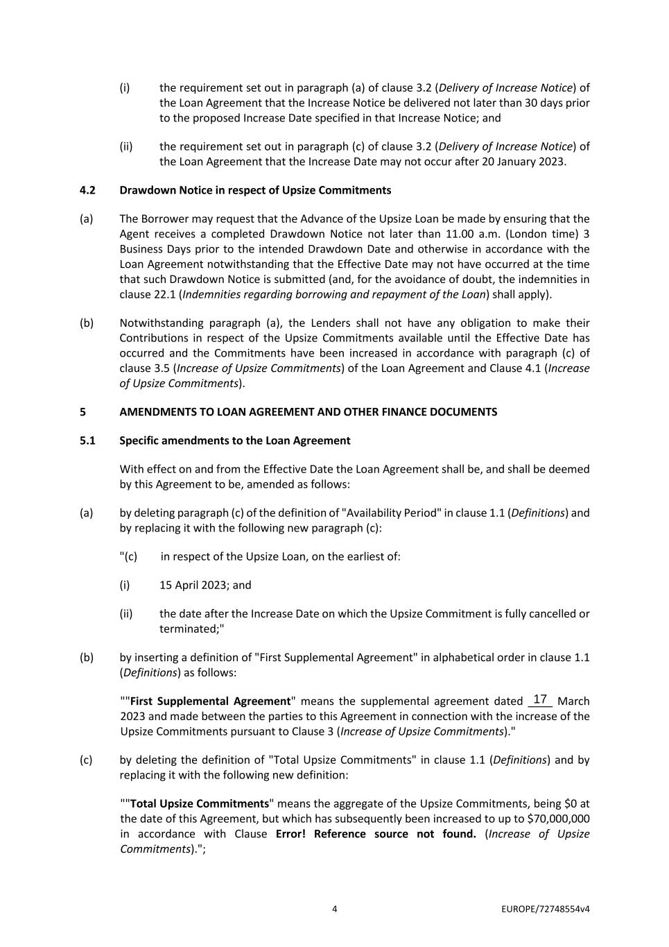 4 EUROPE/72748554v4 (i) the requirement set out in paragraph (a) of clause 3.2 (Delivery of Increase Notice) of the Loan Agreement that the Increase Notice be delivered not later than 30 days prior to the proposed Increase Date specified in that Increase Notice; and (ii) the requirement set out in paragraph (c) of clause 3.2 (Delivery of Increase Notice) of the Loan Agreement that the Increase Date may not occur after 20 January 2023. 4.2 Drawdown Notice in respect of Upsize Commitments (a) The Borrower may request that the Advance of the Upsize Loan be made by ensuring that the Agent receives a completed Drawdown Notice not later than 11.00 a.m. (London time) 3 Business Days prior to the intended Drawdown Date and otherwise in accordance with the Loan Agreement notwithstanding that the Effective Date may not have occurred at the time that such Drawdown Notice is submitted (and, for the avoidance of doubt, the indemnities in clause 22.1 (Indemnities regarding borrowing and repayment of the Loan) shall apply). (b) Notwithstanding paragraph (a), the Lenders shall not have any obligation to make their Contributions in respect of the Upsize Commitments available until the Effective Date has occurred and the Commitments have been increased in accordance with paragraph (c) of clause 3.5 (Increase of Upsize Commitments) of the Loan Agreement and Clause 4.1 (Increase of Upsize Commitments). 5 AMENDMENTS TO LOAN AGREEMENT AND OTHER FINANCE DOCUMENTS 5.1 Specific amendments to the Loan Agreement With effect on and from the Effective Date the Loan Agreement shall be, and shall be deemed by this Agreement to be, amended as follows: (a) by deleting paragraph (c) of the definition of "Availability Period" in clause 1.1 (Definitions) and by replacing it with the following new paragraph (c): "(c) in respect of the Upsize Loan, on the earliest of: (i) 15 April 2023; and (ii) the date after the Increase Date on which the Upsize Commitment is fully cancelled or terminated;" (b) by inserting a definition of "First Supplemental Agreement" in alphabetical order in clause 1.1 (Definitions) as follows: ""First Supplemental Agreement" means the supplemental agreement dated ____ March 2023 and made between the parties to this Agreement in connection with the increase of the Upsize Commitments pursuant to Clause 3 (Increase of Upsize Commitments)." (c) by deleting the definition of "Total Upsize Commitments" in clause 1.1 (Definitions) and by replacing it with the following new definition: ""Total Upsize Commitments" means the aggregate of the Upsize Commitments, being $0 at the date of this Agreement, but which has subsequently been increased to up to $70,000,000 in accordance with Clause Error! Reference source not found. (Increase of Upsize Commitments)."; 17