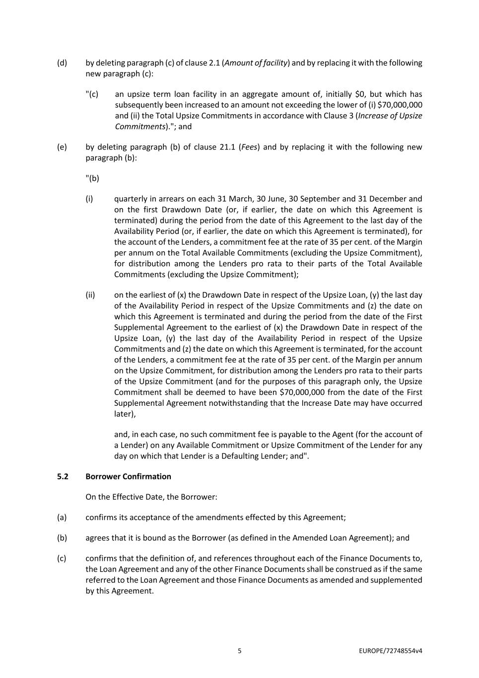 5 EUROPE/72748554v4 (d) by deleting paragraph (c) of clause 2.1 (Amount of facility) and by replacing it with the following new paragraph (c): "(c) an upsize term loan facility in an aggregate amount of, initially $0, but which has subsequently been increased to an amount not exceeding the lower of (i) $70,000,000 and (ii) the Total Upsize Commitments in accordance with Clause 3 (Increase of Upsize Commitments)."; and (e) by deleting paragraph (b) of clause 21.1 (Fees) and by replacing it with the following new paragraph (b): "(b) (i) quarterly in arrears on each 31 March, 30 June, 30 September and 31 December and on the first Drawdown Date (or, if earlier, the date on which this Agreement is terminated) during the period from the date of this Agreement to the last day of the Availability Period (or, if earlier, the date on which this Agreement is terminated), for the account of the Lenders, a commitment fee at the rate of 35 per cent. of the Margin per annum on the Total Available Commitments (excluding the Upsize Commitment), for distribution among the Lenders pro rata to their parts of the Total Available Commitments (excluding the Upsize Commitment); (ii) on the earliest of (x) the Drawdown Date in respect of the Upsize Loan, (y) the last day of the Availability Period in respect of the Upsize Commitments and (z) the date on which this Agreement is terminated and during the period from the date of the First Supplemental Agreement to the earliest of (x) the Drawdown Date in respect of the Upsize Loan, (y) the last day of the Availability Period in respect of the Upsize Commitments and (z) the date on which this Agreement is terminated, for the account of the Lenders, a commitment fee at the rate of 35 per cent. of the Margin per annum on the Upsize Commitment, for distribution among the Lenders pro rata to their parts of the Upsize Commitment (and for the purposes of this paragraph only, the Upsize Commitment shall be deemed to have been $70,000,000 from the date of the First Supplemental Agreement notwithstanding that the Increase Date may have occurred later), and, in each case, no such commitment fee is payable to the Agent (for the account of a Lender) on any Available Commitment or Upsize Commitment of the Lender for any day on which that Lender is a Defaulting Lender; and". 5.2 Borrower Confirmation On the Effective Date, the Borrower: (a) confirms its acceptance of the amendments effected by this Agreement; (b) agrees that it is bound as the Borrower (as defined in the Amended Loan Agreement); and (c) confirms that the definition of, and references throughout each of the Finance Documents to, the Loan Agreement and any of the other Finance Documents shall be construed as if the same referred to the Loan Agreement and those Finance Documents as amended and supplemented by this Agreement.