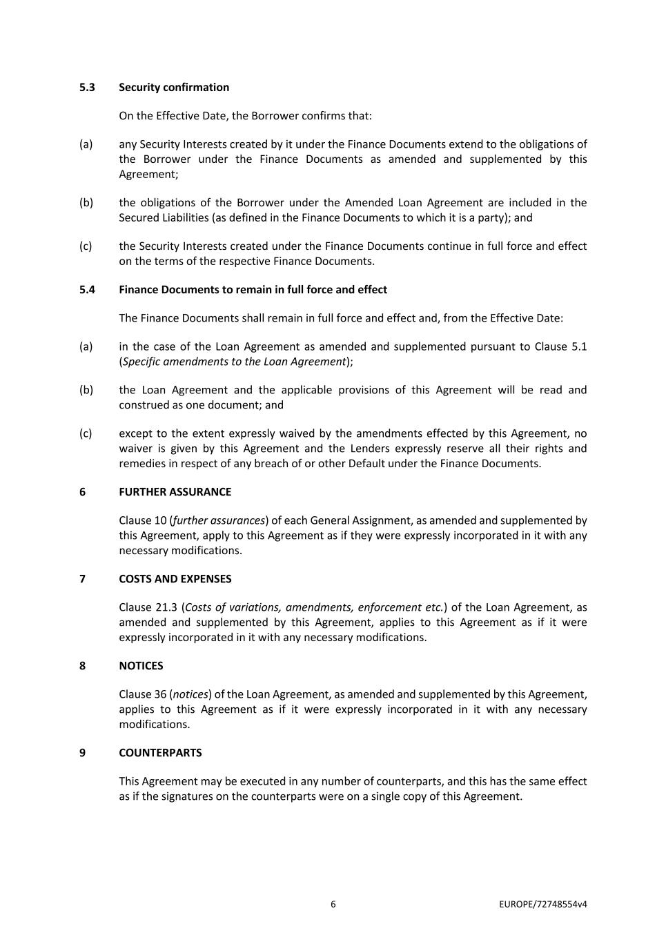 6 EUROPE/72748554v4 5.3 Security confirmation On the Effective Date, the Borrower confirms that: (a) any Security Interests created by it under the Finance Documents extend to the obligations of the Borrower under the Finance Documents as amended and supplemented by this Agreement; (b) the obligations of the Borrower under the Amended Loan Agreement are included in the Secured Liabilities (as defined in the Finance Documents to which it is a party); and (c) the Security Interests created under the Finance Documents continue in full force and effect on the terms of the respective Finance Documents. 5.4 Finance Documents to remain in full force and effect The Finance Documents shall remain in full force and effect and, from the Effective Date: (a) in the case of the Loan Agreement as amended and supplemented pursuant to Clause 5.1 (Specific amendments to the Loan Agreement); (b) the Loan Agreement and the applicable provisions of this Agreement will be read and construed as one document; and (c) except to the extent expressly waived by the amendments effected by this Agreement, no waiver is given by this Agreement and the Lenders expressly reserve all their rights and remedies in respect of any breach of or other Default under the Finance Documents. 6 FURTHER ASSURANCE Clause 10 (further assurances) of each General Assignment, as amended and supplemented by this Agreement, apply to this Agreement as if they were expressly incorporated in it with any necessary modifications. 7 COSTS AND EXPENSES Clause 21.3 (Costs of variations, amendments, enforcement etc.) of the Loan Agreement, as amended and supplemented by this Agreement, applies to this Agreement as if it were expressly incorporated in it with any necessary modifications. 8 NOTICES Clause 36 (notices) of the Loan Agreement, as amended and supplemented by this Agreement, applies to this Agreement as if it were expressly incorporated in it with any necessary modifications. 9 COUNTERPARTS This Agreement may be executed in any number of counterparts, and this has the same effect as if the signatures on the counterparts were on a single copy of this Agreement.