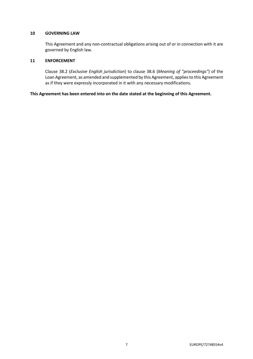 7 EUROPE/72748554v4 10 GOVERNING LAW This Agreement and any non-contractual obligations arising out of or in connection with it are governed by English law. 11 ENFORCEMENT Clause 38.2 (Exclusive English jurisdiction) to clause 38.6 (Meaning of "proceedings") of the Loan Agreement, as amended and supplemented by this Agreement, applies to this Agreement as if they were expressly incorporated in it with any necessary modifications. This Agreement has been entered into on the date stated at the beginning of this Agreement.
