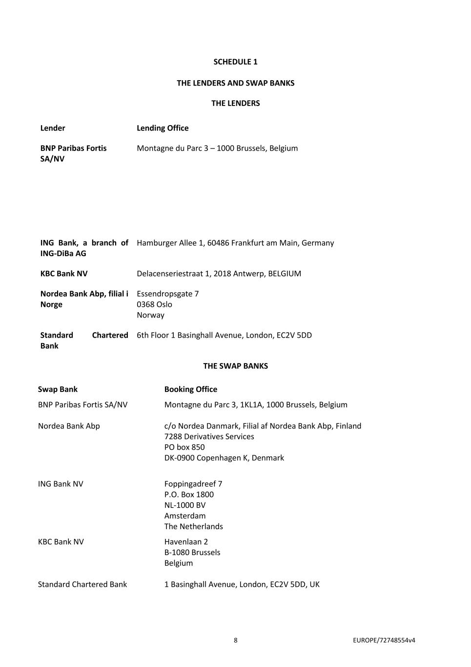 8 EUROPE/72748554v4 SCHEDULE 1 THE LENDERS AND SWAP BANKS THE LENDERS Lender Lending Office BNP Paribas Fortis SA/NV Montagne du Parc 3 – 1000 Brussels, Belgium ING Bank, a branch of ING-DiBa AG Hamburger Allee 1, 60486 Frankfurt am Main, Germany KBC Bank NV Delacenseriestraat 1, 2018 Antwerp, BELGIUM Nordea Bank Abp, filial i Norge Essendropsgate 7 0368 Oslo Norway Standard Chartered Bank 6th Floor 1 Basinghall Avenue, London, EC2V 5DD THE SWAP BANKS Swap Bank Booking Office BNP Paribas Fortis SA/NV Montagne du Parc 3, 1KL1A, 1000 Brussels, Belgium Nordea Bank Abp c/o Nordea Danmark, Filial af Nordea Bank Abp, Finland 7288 Derivatives Services PO box 850 DK-0900 Copenhagen K, Denmark ING Bank NV Foppingadreef 7 P.O. Box 1800 NL-1000 BV Amsterdam The Netherlands KBC Bank NV Havenlaan 2 B-1080 Brussels Belgium Standard Chartered Bank 1 Basinghall Avenue, London, EC2V 5DD, UK