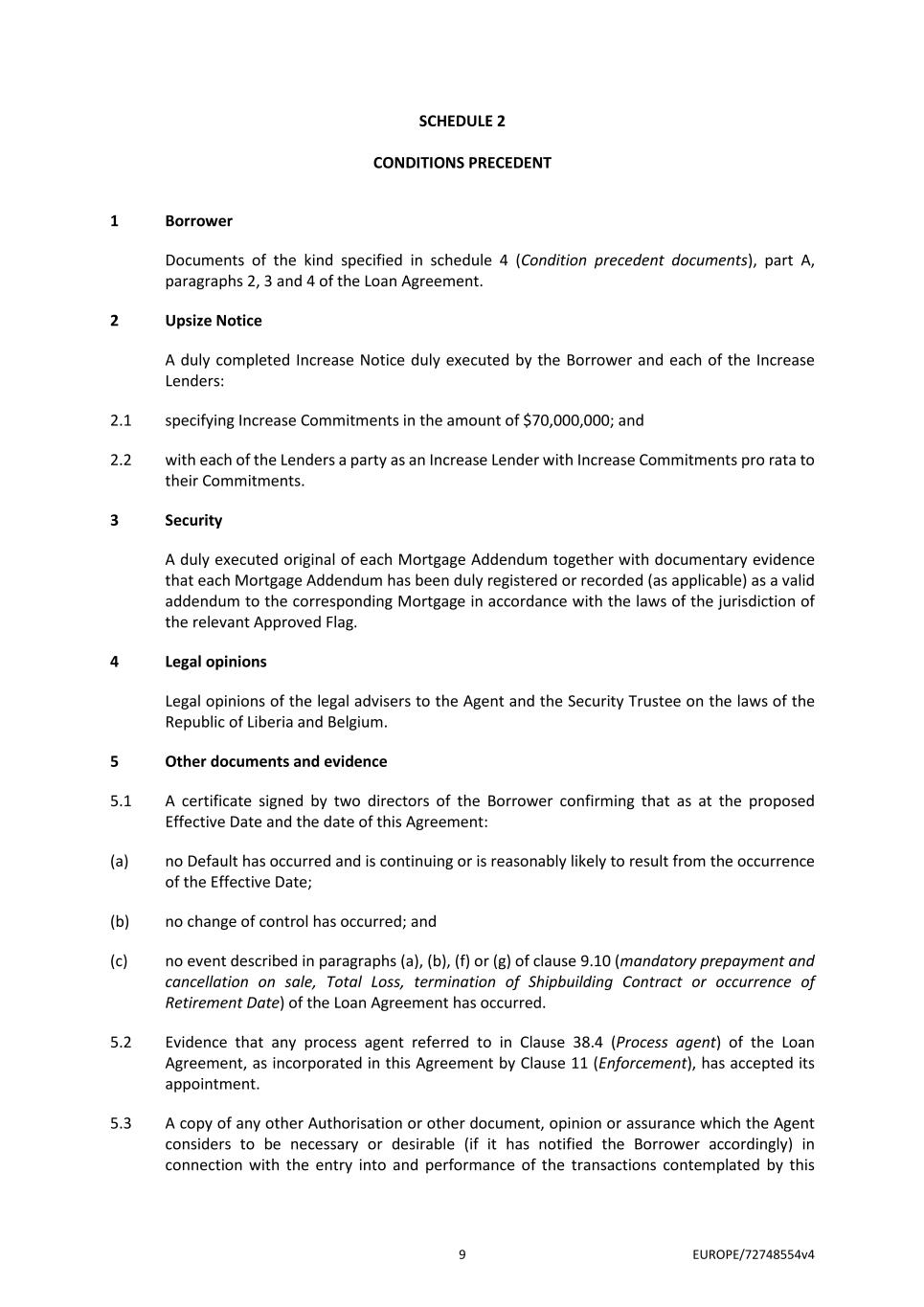 9 EUROPE/72748554v4 SCHEDULE 2 CONDITIONS PRECEDENT 1 Borrower Documents of the kind specified in schedule 4 (Condition precedent documents), part A, paragraphs 2, 3 and 4 of the Loan Agreement. 2 Upsize Notice A duly completed Increase Notice duly executed by the Borrower and each of the Increase Lenders: 2.1 specifying Increase Commitments in the amount of $70,000,000; and 2.2 with each of the Lenders a party as an Increase Lender with Increase Commitments pro rata to their Commitments. 3 Security A duly executed original of each Mortgage Addendum together with documentary evidence that each Mortgage Addendum has been duly registered or recorded (as applicable) as a valid addendum to the corresponding Mortgage in accordance with the laws of the jurisdiction of the relevant Approved Flag. 4 Legal opinions Legal opinions of the legal advisers to the Agent and the Security Trustee on the laws of the Republic of Liberia and Belgium. 5 Other documents and evidence 5.1 A certificate signed by two directors of the Borrower confirming that as at the proposed Effective Date and the date of this Agreement: (a) no Default has occurred and is continuing or is reasonably likely to result from the occurrence of the Effective Date; (b) no change of control has occurred; and (c) no event described in paragraphs (a), (b), (f) or (g) of clause 9.10 (mandatory prepayment and cancellation on sale, Total Loss, termination of Shipbuilding Contract or occurrence of Retirement Date) of the Loan Agreement has occurred. 5.2 Evidence that any process agent referred to in Clause 38.4 (Process agent) of the Loan Agreement, as incorporated in this Agreement by Clause 11 (Enforcement), has accepted its appointment. 5.3 A copy of any other Authorisation or other document, opinion or assurance which the Agent considers to be necessary or desirable (if it has notified the Borrower accordingly) in connection with the entry into and performance of the transactions contemplated by this