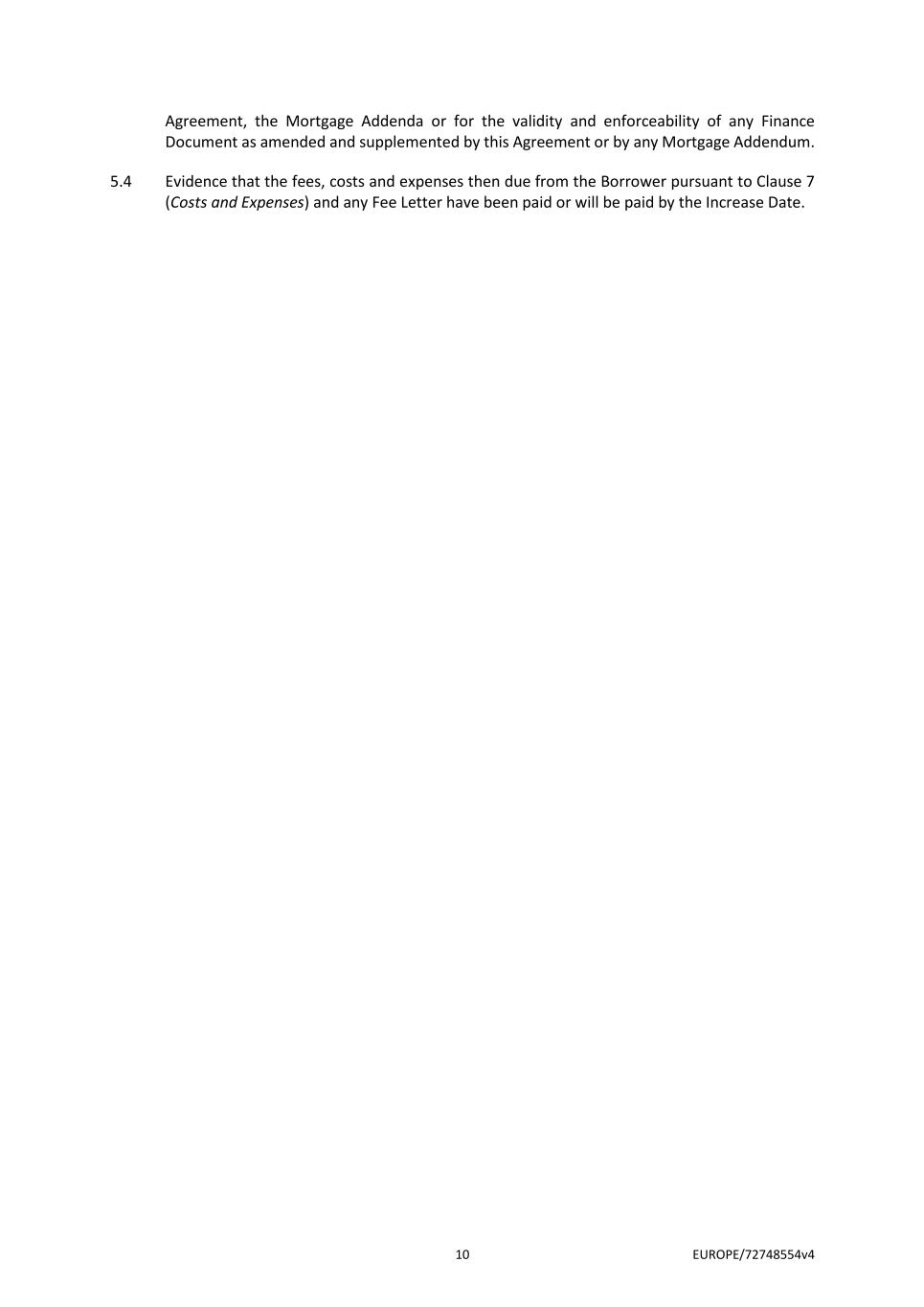 10 EUROPE/72748554v4 Agreement, the Mortgage Addenda or for the validity and enforceability of any Finance Document as amended and supplemented by this Agreement or by any Mortgage Addendum. 5.4 Evidence that the fees, costs and expenses then due from the Borrower pursuant to Clause 7 (Costs and Expenses) and any Fee Letter have been paid or will be paid by the Increase Date.