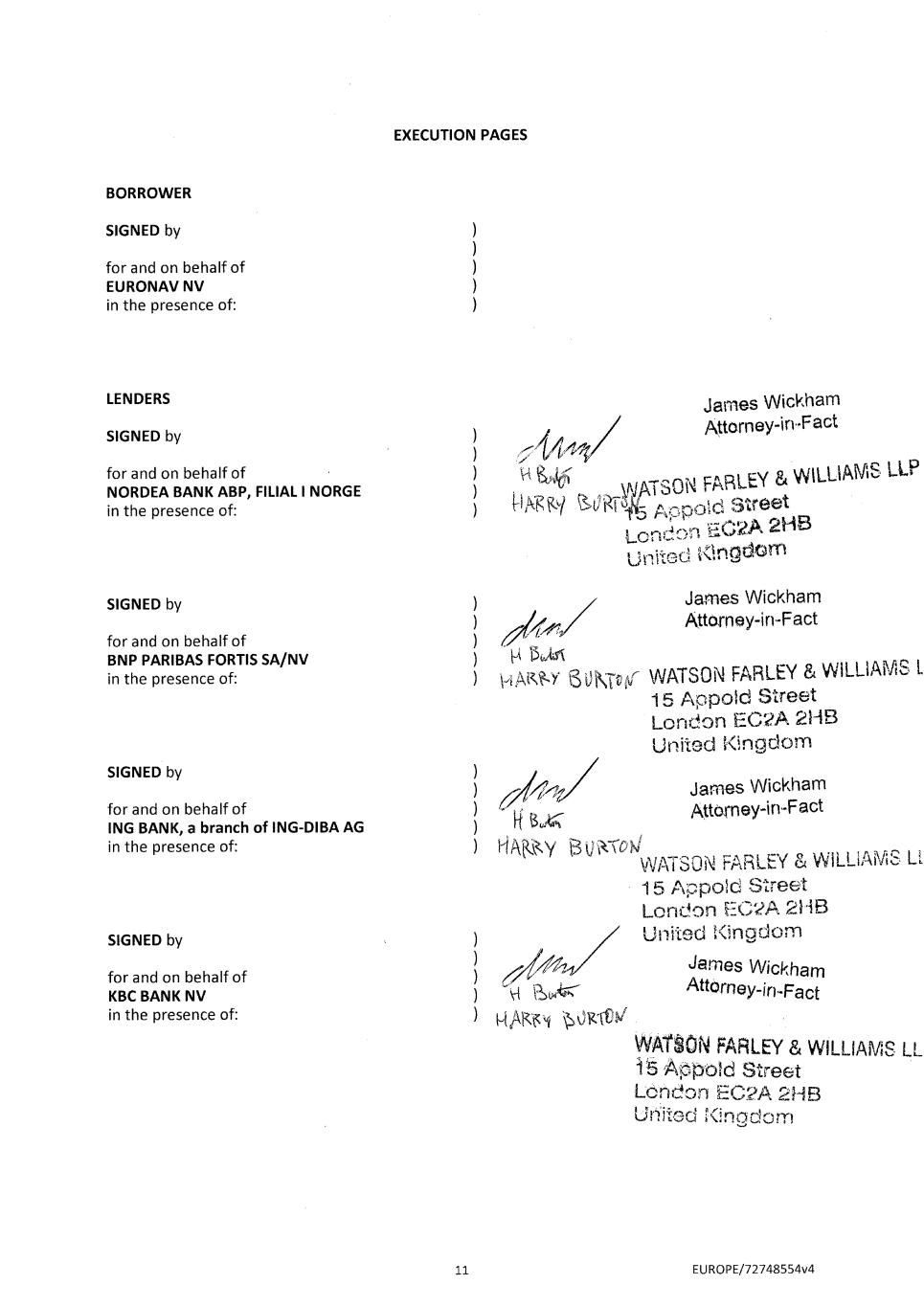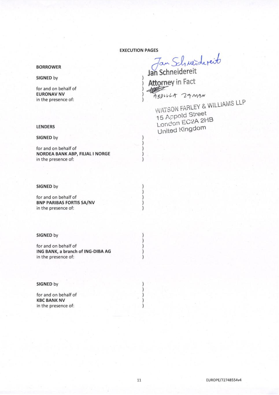 EXECUTION PAGES BORROWER )SIGNED by ) forandoti behalf of EURONAVNV in the presence of: LENDERS James Wickham Attorney-it-Fact SIGNED by l·'/٠ WILLIAMS LLP اً؛٨جة ؤأىة٢يقاً|0ئي ثة!اث؟ج ه London Ε02.Α 2ΗΒ Kingdom ٧أ٦ةى؛أ for and on behalf of NORDEA BANK ABP, FILIAL I NORGE In the presence of: ) James Wickham Attorney-ifi-Fact )SIGNED by ) forand on behalf of(ج BNP PARIBAS FORTIS SA/NV In the presence of: j μ iSfcM ) HAily §ΰΚχνί WATSON FARLEY ه WILLIAMS ا 15Appo!tí Street London EC2Ä SHS United Kingdom )SIGNED by James Wickham Attomey-imFact ) )forandonbefialfof ING BANK, a branch of ING-DIBA AG in tfie presence of: c؛H'u /( Im Bu١vr،>K) WATSON FARLEY & WiLLiAMS Li ISAppoid Street London E؛C2A 2ΗΒ United Kingdom ^^esWickham Attomey-in-Fac )SIGNED by forand on behalf of KBC BANK NV in the presence of: : Vi صه٠ك IIQH FARLEY ه WiLLiAMS LL Ifsid Street London EC2A SHB United ،Kingdom EUROPE/72748554V411