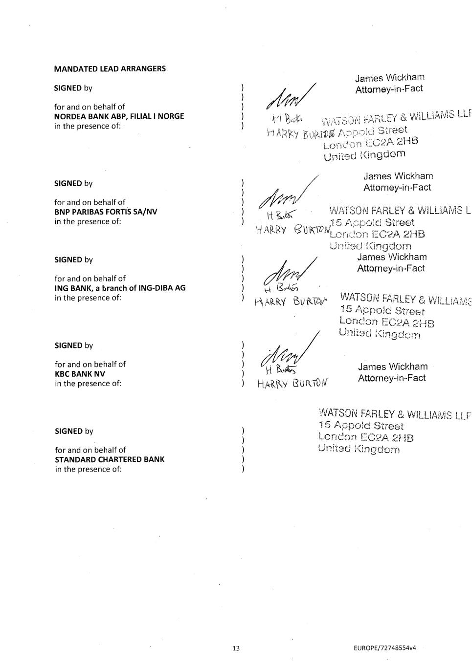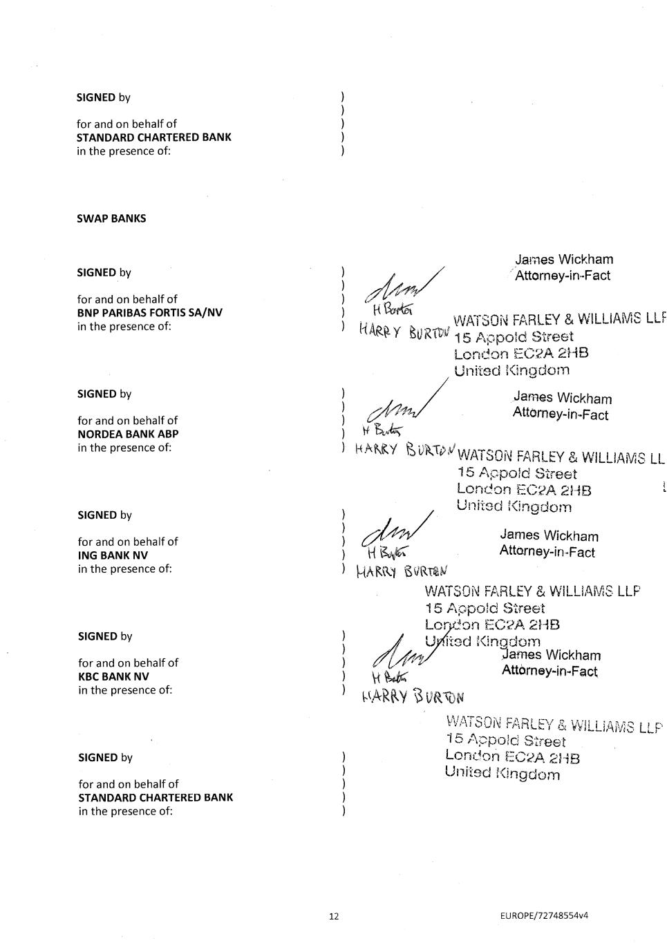 )SIGNED by ) )for and on behalf of STANDARD CHARTERED BANK in the presence of: ) SWAP BANKS James Wickham Attomey-in-Fact)SIGNED by ) for and on behalf of BNP PARIBAS FORTIS SA/NV in the presence of: EuRTPä/ WATSON FARLEY & WILLIAMS LLF 15 Appo Id Street London EC2A 2HB United Kingdom James Wickham Atiörney-in-Fact )SIGNED by ff ؟tJop HAKfcY WATSON FARLEY & WILLIAMS LL 15 Appoid Street London EC2A 2HB United Kingdom for and on behalf of NORDEA BANK ABP in the presence of: ؛ )SIGNED by ) James Wickham Attorney-in-Fact)for and on behalf of ING BANK NV in the presence of: ٥١ΐ£Γ؛؛؛ Η */( MAR\\1 SVRrt WATSON FARLEY & WILLIAMS LLF 15 Appoid Street London EC2A 2HB )SIGNED by U/fited Kingdom) James Wickham Attorney-in-Factyl/f*v ) VtM )؛، va٢öi١f؟ for and on behalf of KBC BANK NV in the presence of: ) WATSON FARLEY & WILLIAMS 15 Appoid Street London EC2A 2B8 United Kingdom LLF' SIGNED by for and on behalf of STANDARD CHARTERED BANK in the presence of: EUROPE/72748554V412