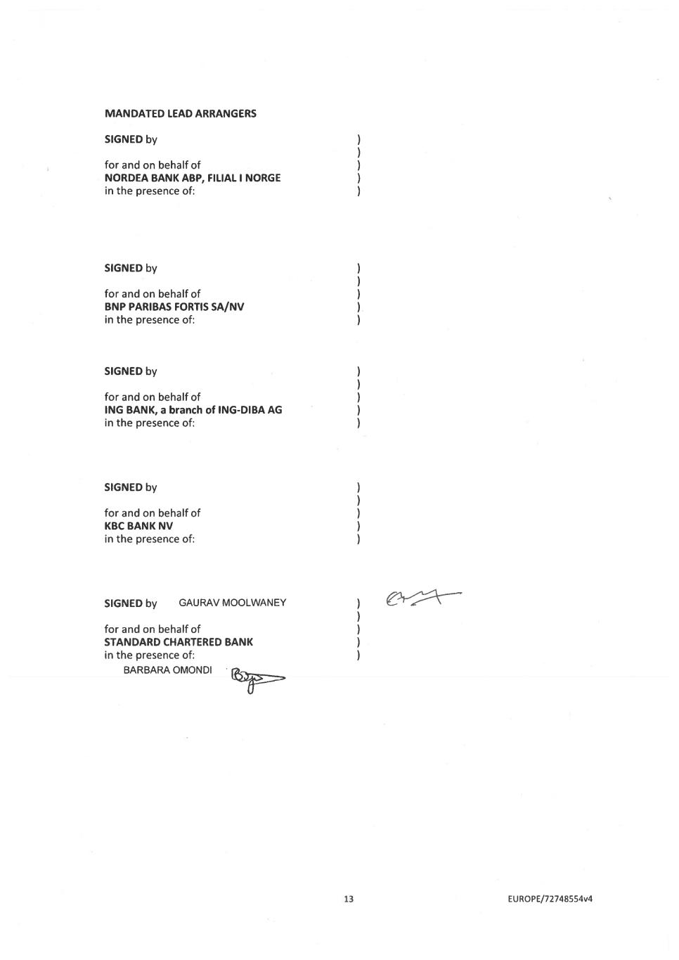 MANDATED LEAD ARRANGERS SIGNED by for and on behalf of NORDEA BANK ABP, FIUAL I NORGE in the presence of: SIGNED by for and on behalf of BNP PARIBAS FORTIS SA/NV in the presence of: SIGNED by for and on behalf of ING BANK, a branch of ING-DIBA AG in the presence of: SIGNED by for and on behalf of KBCBANKNV in the presence of: SIGNED by GAURAV MOOLWANEY for and on behalf of STANDARD CHARTERED BANK in the presence of: BARBARAOMONDI 13 EUROPE/72748554v4