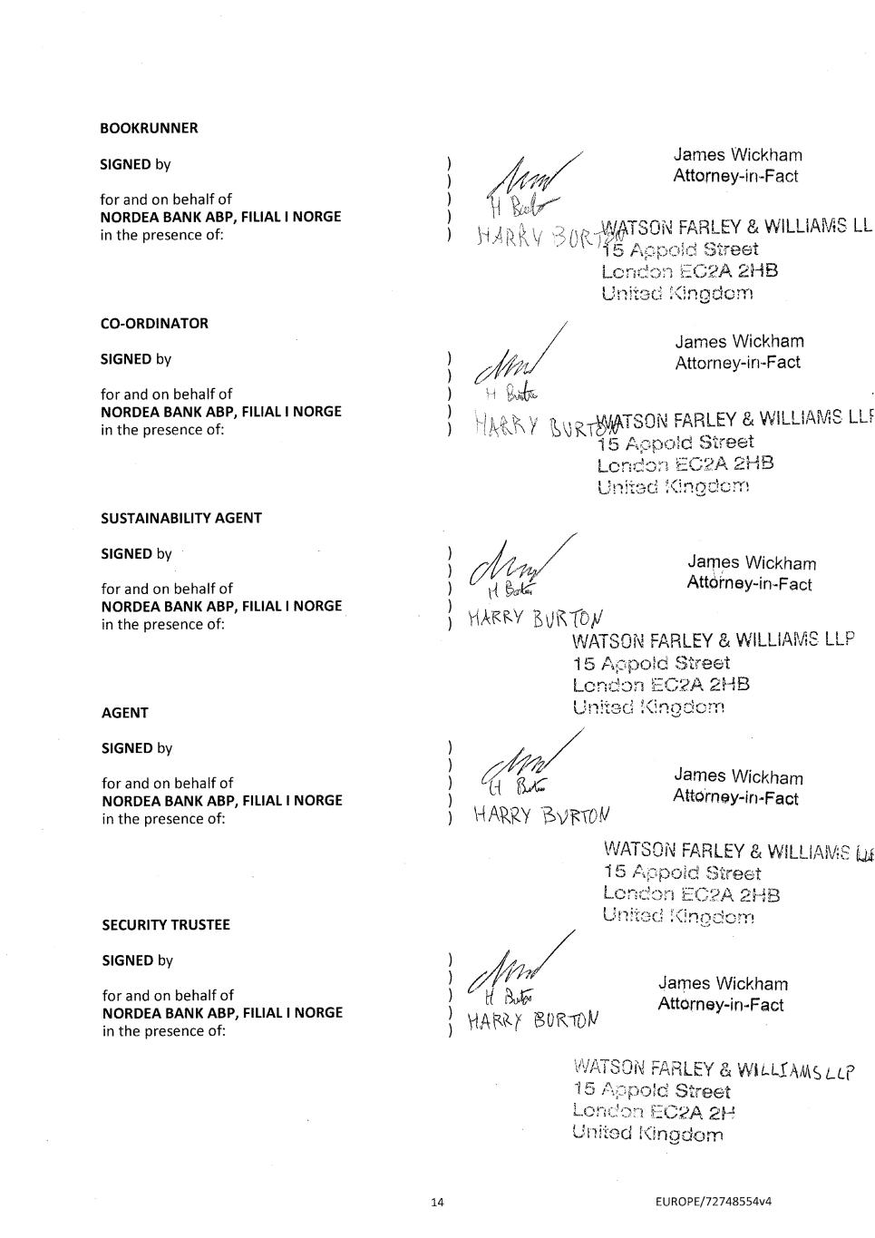 BOOKRUNNER James Wickham Attorney-in-Fact)SIGNED by ) vm %À/*'for and on behalf of NORDEA BANK ABP, FILIAL I NORGE in the presence of: ٥ ٦ 5 Appold Street London EG2A 2HB Unitoci Kingdom CO-ORDINATOR James Wickham Attorney-in-Fact)SIGNED by ) kfc؟)for and on behalf of NORDEA BANK ABP, FILIAL I NORGE in the presence of: H ) LLFHiiKy farley & WILLIAIV ؟٧ 15 Appold Street London EC2A 2HB Unitoci Kingdom SUSTAINABILITY AGENT )SIGNED by James Wickham Attömey-in-Fact ) y()for and on behalf of NORDEA BANK ABP, FILIAL I NORGE in the presence of: Y BiJRW ؛؛؟،Vi A ) WATSON FARLEY & WILLIAi ١؛/ S LLP 15 Appold Street London EC2Ä 2HB Unitoci KingdomAGENT )SIGNED by ) James Wickham Attorney-in-Fact )for and on behalf of NORDEA BANK ABP, FILIAL I NORGE in the presence of: U fU: ) HARRY) WATSON FARLEY & WILLIAMS ٤j¿ 15 Appold Street London EC2A 2HB Lhi-tGci KingdomSECURITY TRUSTEE SIGNED by d James Wickham Attorney-in-Factfor and on behalf of NORDEA BANK ABP, FILIAL I NORGE in the presence of: MAW Bt)f\TD^) WAiSQN FARLEYS، WILLIAMS LLP 15 Appold Street London EC2A 2H Un؛is-cl Kingdom EUROPE/72748554V414