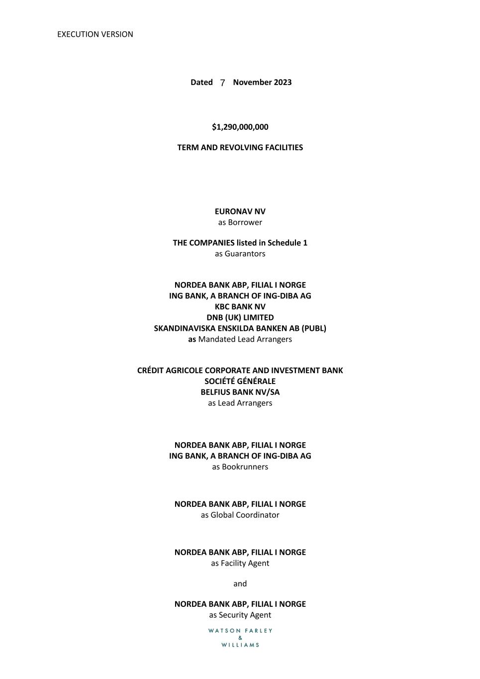 EXECUTION VERSION Dated November 2023 $1,290,000,000 TERM AND REVOLVING FACILITIES EURONAV NV as Borrower THE COMPANIES listed in Schedule 1 as Guarantors NORDEA BANK ABP, FILIAL I NORGE ING BANK, A BRANCH OF ING-DIBA AG KBC BANK NV DNB (UK) LIMITED SKANDINAVISKA ENSKILDA BANKEN AB (PUBL) as Mandated Lead Arrangers CRÉDIT AGRICOLE CORPORATE AND INVESTMENT BANK SOCIÉTÉ GÉNÉRALE BELFIUS BANK NV/SA as Lead Arrangers NORDEA BANK ABP, FILIAL I NORGE ING BANK, A BRANCH OF ING-DIBA AG as Bookrunners NORDEA BANK ABP, FILIAL I NORGE as Global Coordinator NORDEA BANK ABP, FILIAL I NORGE as Facility Agent and NORDEA BANK ABP, FILIAL I NORGE as Security Agent 7