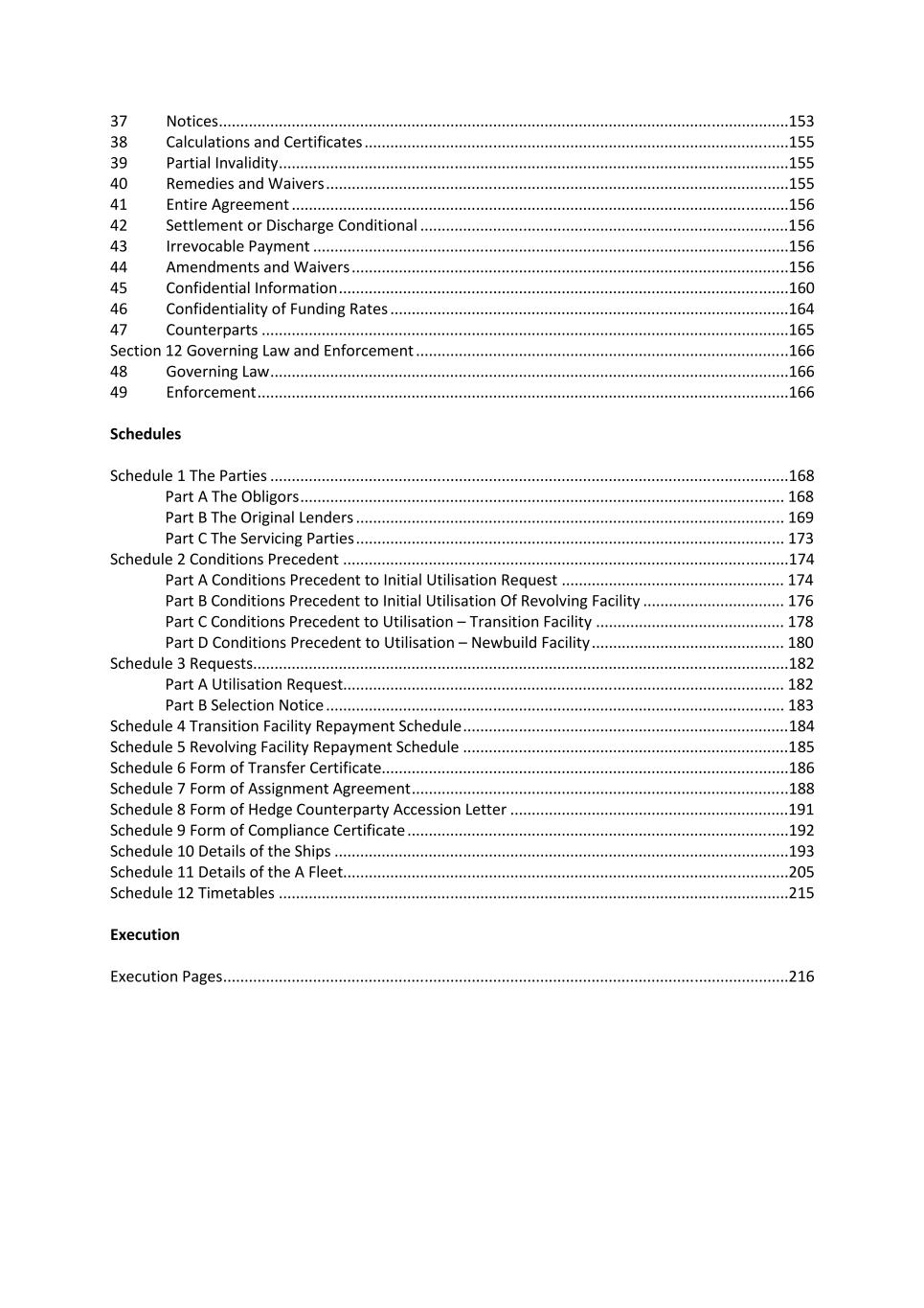 37 Notices .....................................................................................................................................153 38 Calculations and Certificates ...................................................................................................155 39 Partial Invalidity .......................................................................................................................155 40 Remedies and Waivers ............................................................................................................155 41 Entire Agreement ....................................................................................................................156 42 Settlement or Discharge Conditional ......................................................................................156 43 Irrevocable Payment ...............................................................................................................156 44 Amendments and Waivers ......................................................................................................156 45 Confidential Information .........................................................................................................160 46 Confidentiality of Funding Rates .............................................................................................164 47 Counterparts ...........................................................................................................................165 Section 12 Governing Law and Enforcement .......................................................................................166 48 Governing Law .........................................................................................................................166 49 Enforcement ............................................................................................................................166 Schedules Schedule 1 The Parties .........................................................................................................................168 Part A The Obligors ................................................................................................................. 168 Part B The Original Lenders .................................................................................................... 169 Part C The Servicing Parties .................................................................................................... 173 Schedule 2 Conditions Precedent ........................................................................................................174 Part A Conditions Precedent to Initial Utilisation Request .................................................... 174 Part B Conditions Precedent to Initial Utilisation Of Revolving Facility ................................. 176 Part C Conditions Precedent to Utilisation – Transition Facility ............................................ 178 Part D Conditions Precedent to Utilisation – Newbuild Facility ............................................. 180 Schedule 3 Requests .............................................................................................................................182 Part A Utilisation Request....................................................................................................... 182 Part B Selection Notice ........................................................................................................... 183 Schedule 4 Transition Facility Repayment Schedule ............................................................................184 Schedule 5 Revolving Facility Repayment Schedule ............................................................................185 Schedule 6 Form of Transfer Certificate...............................................................................................186 Schedule 7 Form of Assignment Agreement ........................................................................................188 Schedule 8 Form of Hedge Counterparty Accession Letter .................................................................191 Schedule 9 Form of Compliance Certificate .........................................................................................192 Schedule 10 Details of the Ships ..........................................................................................................193 Schedule 11 Details of the A Fleet........................................................................................................205 Schedule 12 Timetables .......................................................................................................................215 Execution Execution Pages ....................................................................................................................................216