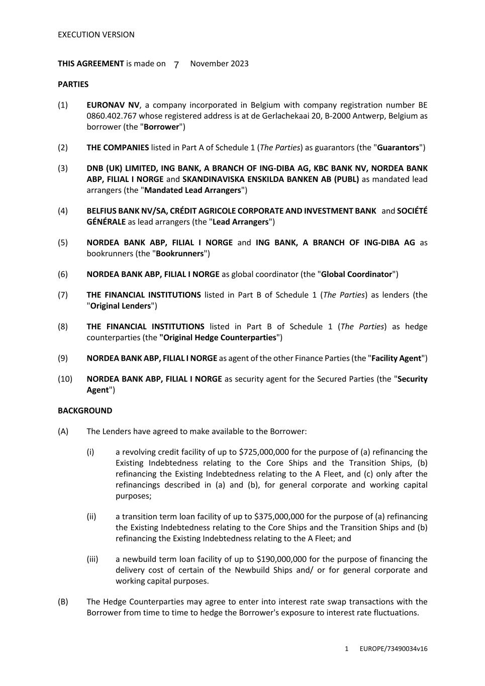 EXECUTION VERSION 1 EUROPE/73490034v16 THIS AGREEMENT is made on November 2023 PARTIES (1) EURONAV NV, a company incorporated in Belgium with company registration number BE 0860.402.767 whose registered address is at de Gerlachekaai 20, B-2000 Antwerp, Belgium as borrower (the "Borrower") (2) THE COMPANIES listed in Part A of Schedule 1 (The Parties) as guarantors (the "Guarantors") (3) DNB (UK) LIMITED, ING BANK, A BRANCH OF ING-DIBA AG, KBC BANK NV, NORDEA BANK ABP, FILIAL I NORGE and SKANDINAVISKA ENSKILDA BANKEN AB (PUBL) as mandated lead arrangers (the "Mandated Lead Arrangers") (4) BELFIUS BANK NV/SA, CRÉDIT AGRICOLE CORPORATE AND INVESTMENT BANK and SOCIÉTÉ GÉNÉRALE as lead arrangers (the "Lead Arrangers") (5) NORDEA BANK ABP, FILIAL I NORGE and ING BANK, A BRANCH OF ING-DIBA AG as bookrunners (the "Bookrunners") (6) NORDEA BANK ABP, FILIAL I NORGE as global coordinator (the "Global Coordinator") (7) THE FINANCIAL INSTITUTIONS listed in Part B of Schedule 1 (The Parties) as lenders (the "Original Lenders") (8) THE FINANCIAL INSTITUTIONS listed in Part B of Schedule 1 (The Parties) as hedge counterparties (the "Original Hedge Counterparties") (9) NORDEA BANK ABP, FILIAL I NORGE as agent of the other Finance Parties (the "Facility Agent") (10) NORDEA BANK ABP, FILIAL I NORGE as security agent for the Secured Parties (the "Security Agent") BACKGROUND (A) The Lenders have agreed to make available to the Borrower: (i) a revolving credit facility of up to $725,000,000 for the purpose of (a) refinancing the Existing Indebtedness relating to the Core Ships and the Transition Ships, (b) refinancing the Existing Indebtedness relating to the A Fleet, and (c) only after the refinancings described in (a) and (b), for general corporate and working capital purposes; (ii) a transition term loan facility of up to $375,000,000 for the purpose of (a) refinancing the Existing Indebtedness relating to the Core Ships and the Transition Ships and (b) refinancing the Existing Indebtedness relating to the A Fleet; and (iii) a newbuild term loan facility of up to $190,000,000 for the purpose of financing the delivery cost of certain of the Newbuild Ships and/ or for general corporate and working capital purposes. (B) The Hedge Counterparties may agree to enter into interest rate swap transactions with the Borrower from time to time to hedge the Borrower's exposure to interest rate fluctuations. 7