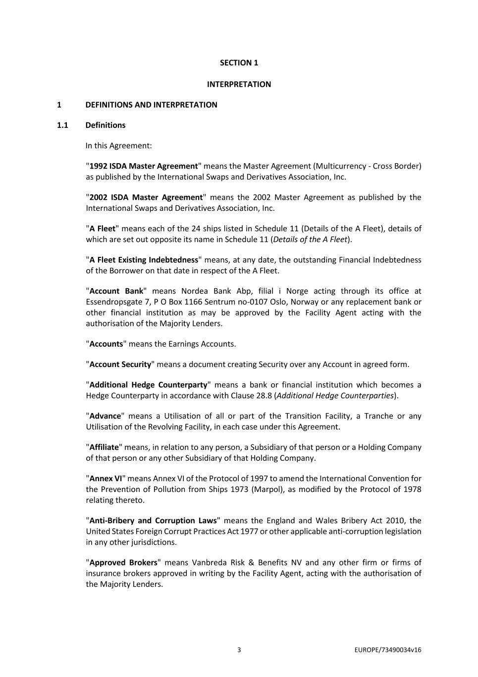 3 EUROPE/73490034v16 SECTION 1 INTERPRETATION 1 DEFINITIONS AND INTERPRETATION 1.1 Definitions In this Agreement: "1992 ISDA Master Agreement" means the Master Agreement (Multicurrency - Cross Border) as published by the International Swaps and Derivatives Association, Inc. "2002 ISDA Master Agreement" means the 2002 Master Agreement as published by the International Swaps and Derivatives Association, Inc. "A Fleet" means each of the 24 ships listed in Schedule 11 (Details of the A Fleet), details of which are set out opposite its name in Schedule 11 (Details of the A Fleet). "A Fleet Existing Indebtedness" means, at any date, the outstanding Financial Indebtedness of the Borrower on that date in respect of the A Fleet. "Account Bank" means Nordea Bank Abp, filial i Norge acting through its office at Essendropsgate 7, P O Box 1166 Sentrum no-0107 Oslo, Norway or any replacement bank or other financial institution as may be approved by the Facility Agent acting with the authorisation of the Majority Lenders. "Accounts" means the Earnings Accounts. "Account Security" means a document creating Security over any Account in agreed form. "Additional Hedge Counterparty" means a bank or financial institution which becomes a Hedge Counterparty in accordance with Clause 28.8 (Additional Hedge Counterparties). "Advance" means a Utilisation of all or part of the Transition Facility, a Tranche or any Utilisation of the Revolving Facility, in each case under this Agreement. "Affiliate" means, in relation to any person, a Subsidiary of that person or a Holding Company of that person or any other Subsidiary of that Holding Company. "Annex VI" means Annex VI of the Protocol of 1997 to amend the International Convention for the Prevention of Pollution from Ships 1973 (Marpol), as modified by the Protocol of 1978 relating thereto. "Anti-Bribery and Corruption Laws" means the England and Wales Bribery Act 2010, the United States Foreign Corrupt Practices Act 1977 or other applicable anti-corruption legislation in any other jurisdictions. "Approved Brokers" means Vanbreda Risk & Benefits NV and any other firm or firms of insurance brokers approved in writing by the Facility Agent, acting with the authorisation of the Majority Lenders.