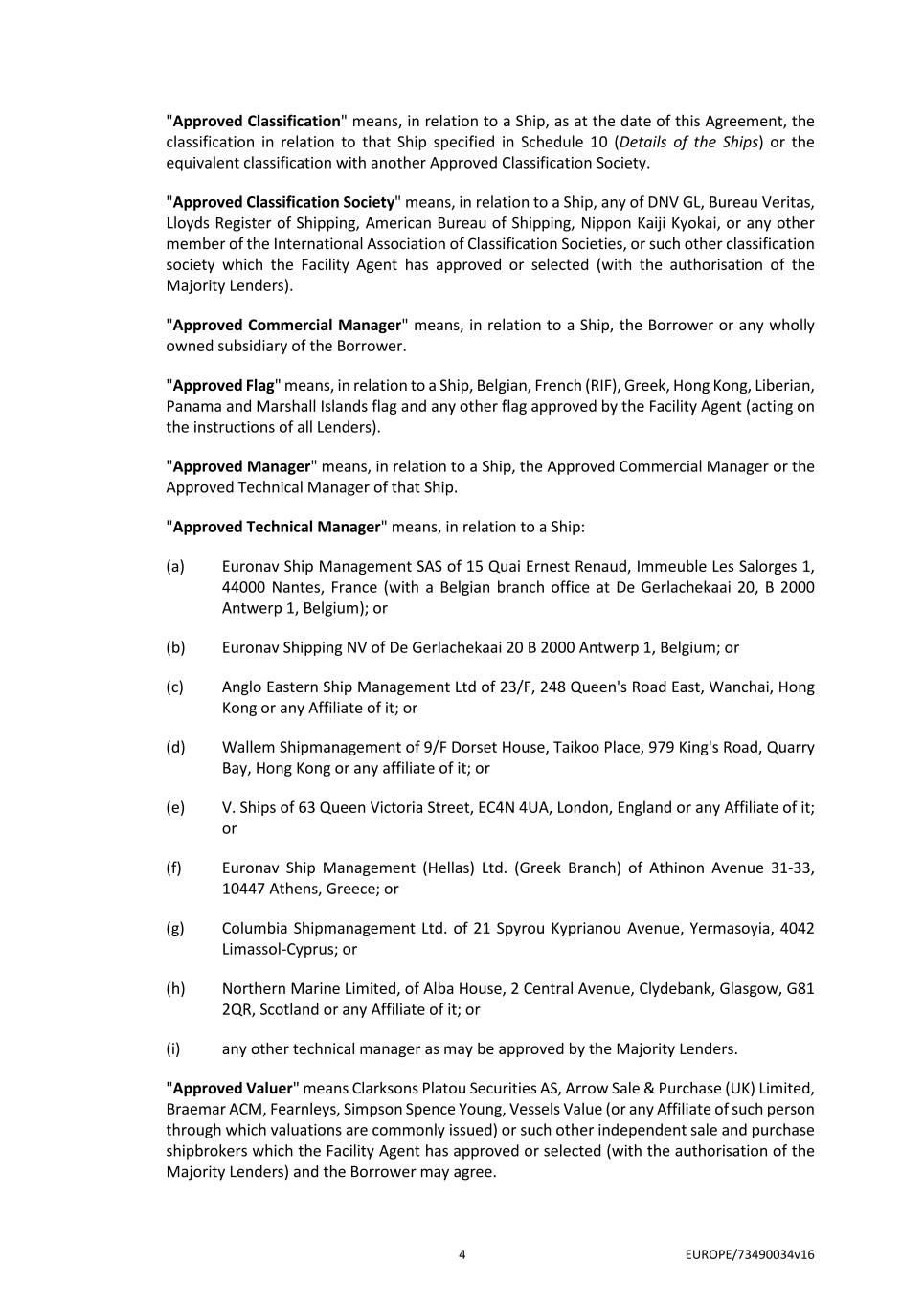 4 EUROPE/73490034v16 "Approved Classification" means, in relation to a Ship, as at the date of this Agreement, the classification in relation to that Ship specified in Schedule 10 (Details of the Ships) or the equivalent classification with another Approved Classification Society. "Approved Classification Society" means, in relation to a Ship, any of DNV GL, Bureau Veritas, Lloyds Register of Shipping, American Bureau of Shipping, Nippon Kaiji Kyokai, or any other member of the International Association of Classification Societies, or such other classification society which the Facility Agent has approved or selected (with the authorisation of the Majority Lenders). "Approved Commercial Manager" means, in relation to a Ship, the Borrower or any wholly owned subsidiary of the Borrower. "Approved Flag" means, in relation to a Ship, Belgian, French (RIF), Greek, Hong Kong, Liberian, Panama and Marshall Islands flag and any other flag approved by the Facility Agent (acting on the instructions of all Lenders). "Approved Manager" means, in relation to a Ship, the Approved Commercial Manager or the Approved Technical Manager of that Ship. "Approved Technical Manager" means, in relation to a Ship: (a) Euronav Ship Management SAS of 15 Quai Ernest Renaud, Immeuble Les Salorges 1, 44000 Nantes, France (with a Belgian branch office at De Gerlachekaai 20, B 2000 Antwerp 1, Belgium); or (b) Euronav Shipping NV of De Gerlachekaai 20 B 2000 Antwerp 1, Belgium; or (c) Anglo Eastern Ship Management Ltd of 23/F, 248 Queen's Road East, Wanchai, Hong Kong or any Affiliate of it; or (d) Wallem Shipmanagement of 9/F Dorset House, Taikoo Place, 979 King's Road, Quarry Bay, Hong Kong or any affiliate of it; or (e) V. Ships of 63 Queen Victoria Street, EC4N 4UA, London, England or any Affiliate of it; or (f) Euronav Ship Management (Hellas) Ltd. (Greek Branch) of Athinon Avenue 31-33, 10447 Athens, Greece; or (g) Columbia Shipmanagement Ltd. of 21 Spyrou Kyprianou Avenue, Yermasoyia, 4042 Limassol-Cyprus; or (h) Northern Marine Limited, of Alba House, 2 Central Avenue, Clydebank, Glasgow, G81 2QR, Scotland or any Affiliate of it; or (i) any other technical manager as may be approved by the Majority Lenders. "Approved Valuer" means Clarksons Platou Securities AS, Arrow Sale & Purchase (UK) Limited, Braemar ACM, Fearnleys, Simpson Spence Young, Vessels Value (or any Affiliate of such person through which valuations are commonly issued) or such other independent sale and purchase shipbrokers which the Facility Agent has approved or selected (with the authorisation of the Majority Lenders) and the Borrower may agree.