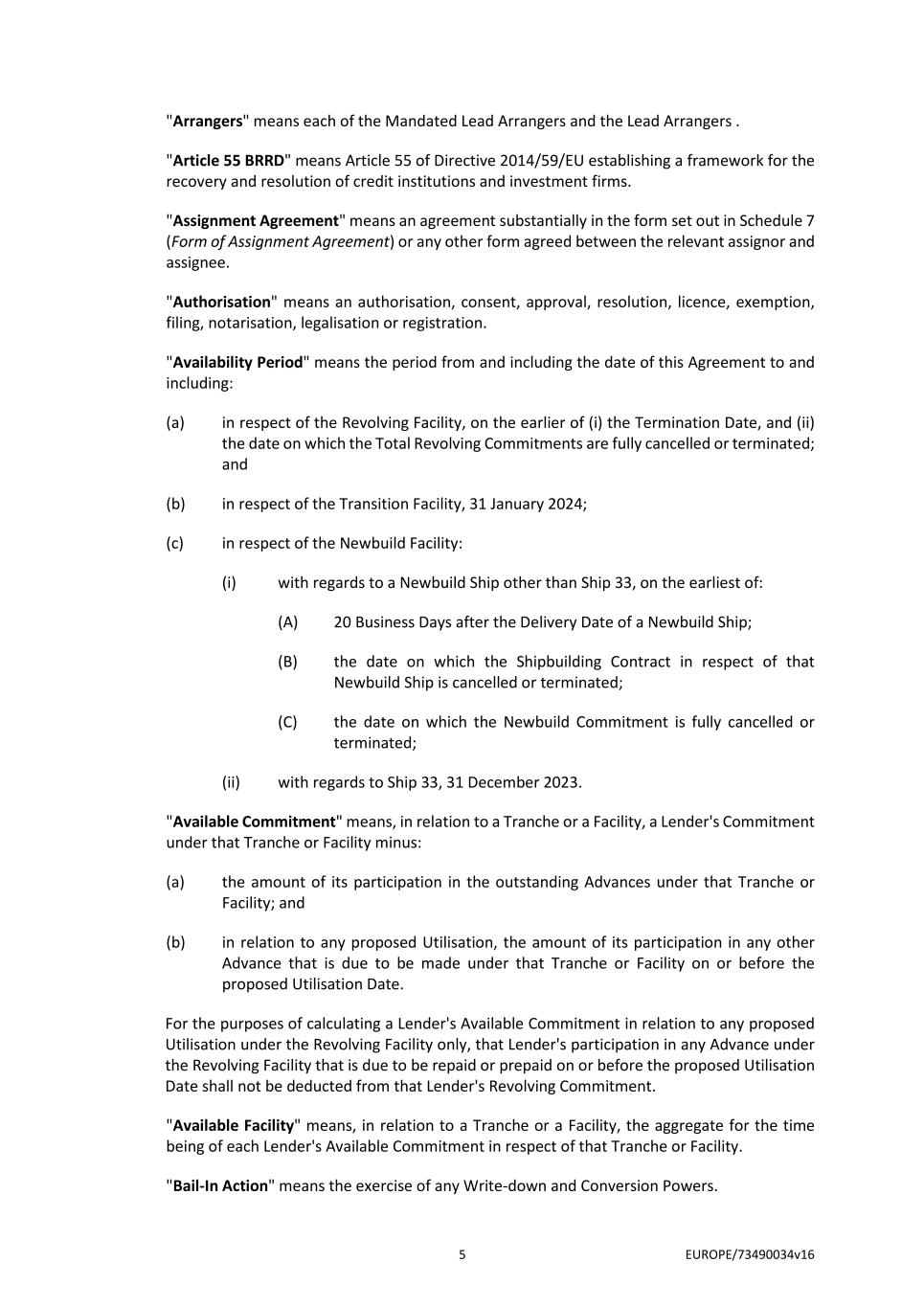 5 EUROPE/73490034v16 "Arrangers" means each of the Mandated Lead Arrangers and the Lead Arrangers . "Article 55 BRRD" means Article 55 of Directive 2014/59/EU establishing a framework for the recovery and resolution of credit institutions and investment firms. "Assignment Agreement" means an agreement substantially in the form set out in Schedule 7 (Form of Assignment Agreement) or any other form agreed between the relevant assignor and assignee. "Authorisation" means an authorisation, consent, approval, resolution, licence, exemption, filing, notarisation, legalisation or registration. "Availability Period" means the period from and including the date of this Agreement to and including: (a) in respect of the Revolving Facility, on the earlier of (i) the Termination Date, and (ii) the date on which the Total Revolving Commitments are fully cancelled or terminated; and (b) in respect of the Transition Facility, 31 January 2024; (c) in respect of the Newbuild Facility: (i) with regards to a Newbuild Ship other than Ship 33, on the earliest of: (A) 20 Business Days after the Delivery Date of a Newbuild Ship; (B) the date on which the Shipbuilding Contract in respect of that Newbuild Ship is cancelled or terminated; (C) the date on which the Newbuild Commitment is fully cancelled or terminated; (ii) with regards to Ship 33, 31 December 2023. "Available Commitment" means, in relation to a Tranche or a Facility, a Lender's Commitment under that Tranche or Facility minus: (a) the amount of its participation in the outstanding Advances under that Tranche or Facility; and (b) in relation to any proposed Utilisation, the amount of its participation in any other Advance that is due to be made under that Tranche or Facility on or before the proposed Utilisation Date. For the purposes of calculating a Lender's Available Commitment in relation to any proposed Utilisation under the Revolving Facility only, that Lender's participation in any Advance under the Revolving Facility that is due to be repaid or prepaid on or before the proposed Utilisation Date shall not be deducted from that Lender's Revolving Commitment. "Available Facility" means, in relation to a Tranche or a Facility, the aggregate for the time being of each Lender's Available Commitment in respect of that Tranche or Facility. "Bail-In Action" means the exercise of any Write-down and Conversion Powers.