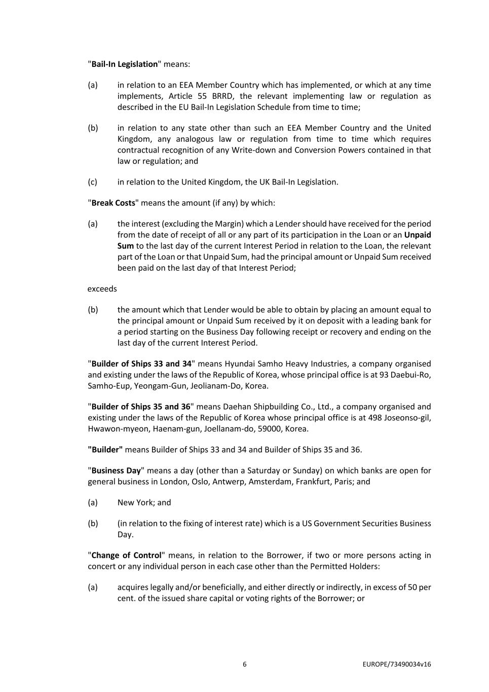 6 EUROPE/73490034v16 "Bail-In Legislation" means: (a) in relation to an EEA Member Country which has implemented, or which at any time implements, Article 55 BRRD, the relevant implementing law or regulation as described in the EU Bail-In Legislation Schedule from time to time; (b) in relation to any state other than such an EEA Member Country and the United Kingdom, any analogous law or regulation from time to time which requires contractual recognition of any Write-down and Conversion Powers contained in that law or regulation; and (c) in relation to the United Kingdom, the UK Bail-In Legislation. "Break Costs" means the amount (if any) by which: (a) the interest (excluding the Margin) which a Lender should have received for the period from the date of receipt of all or any part of its participation in the Loan or an Unpaid Sum to the last day of the current Interest Period in relation to the Loan, the relevant part of the Loan or that Unpaid Sum, had the principal amount or Unpaid Sum received been paid on the last day of that Interest Period; exceeds (b) the amount which that Lender would be able to obtain by placing an amount equal to the principal amount or Unpaid Sum received by it on deposit with a leading bank for a period starting on the Business Day following receipt or recovery and ending on the last day of the current Interest Period. "Builder of Ships 33 and 34" means Hyundai Samho Heavy Industries, a company organised and existing under the laws of the Republic of Korea, whose principal office is at 93 Daebui-Ro, Samho-Eup, Yeongam-Gun, Jeolianam-Do, Korea. "Builder of Ships 35 and 36" means Daehan Shipbuilding Co., Ltd., a company organised and existing under the laws of the Republic of Korea whose principal office is at 498 Joseonso-gil, Hwawon-myeon, Haenam-gun, Joellanam-do, 59000, Korea. "Builder" means Builder of Ships 33 and 34 and Builder of Ships 35 and 36. "Business Day" means a day (other than a Saturday or Sunday) on which banks are open for general business in London, Oslo, Antwerp, Amsterdam, Frankfurt, Paris; and (a) New York; and (b) (in relation to the fixing of interest rate) which is a US Government Securities Business Day. "Change of Control" means, in relation to the Borrower, if two or more persons acting in concert or any individual person in each case other than the Permitted Holders: (a) acquires legally and/or beneficially, and either directly or indirectly, in excess of 50 per cent. of the issued share capital or voting rights of the Borrower; or