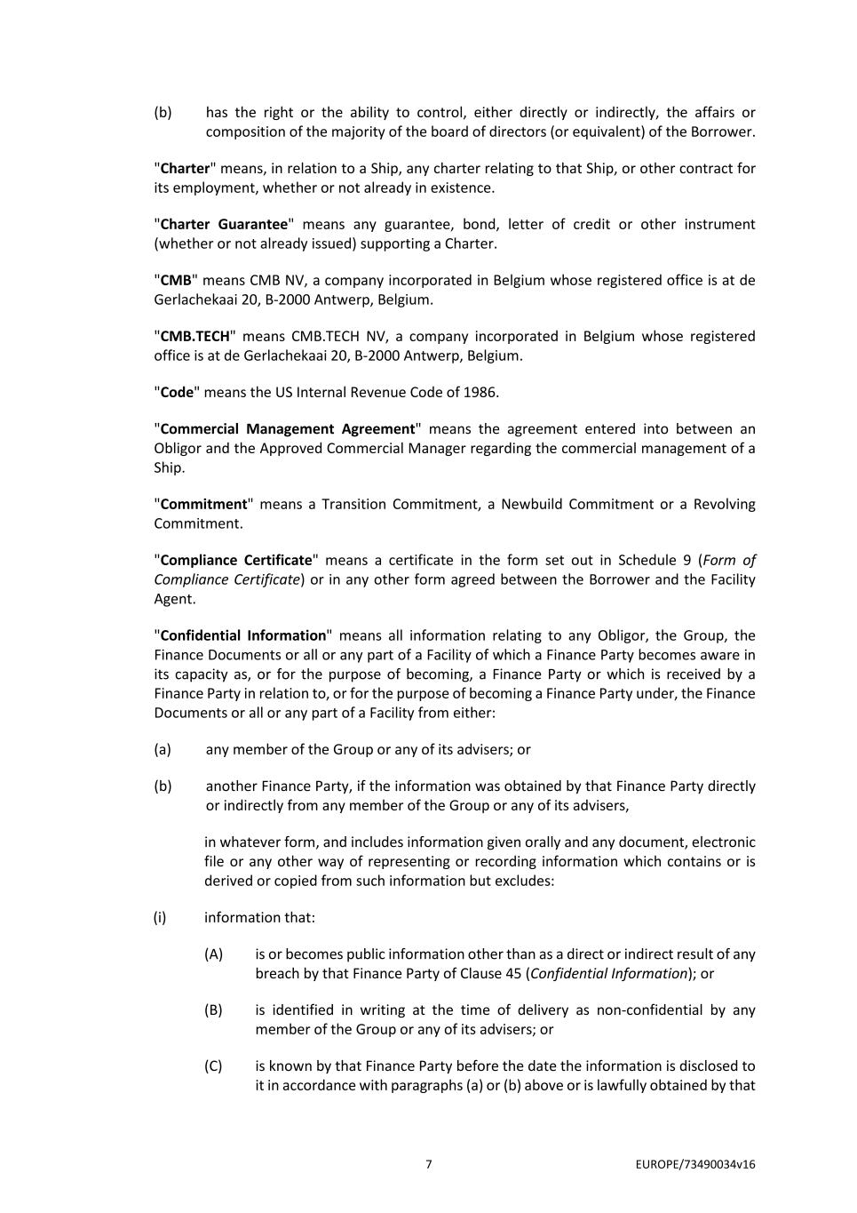 7 EUROPE/73490034v16 (b) has the right or the ability to control, either directly or indirectly, the affairs or composition of the majority of the board of directors (or equivalent) of the Borrower. "Charter" means, in relation to a Ship, any charter relating to that Ship, or other contract for its employment, whether or not already in existence. "Charter Guarantee" means any guarantee, bond, letter of credit or other instrument (whether or not already issued) supporting a Charter. "CMB" means CMB NV, a company incorporated in Belgium whose registered office is at de Gerlachekaai 20, B-2000 Antwerp, Belgium. "CMB.TECH" means CMB.TECH NV, a company incorporated in Belgium whose registered office is at de Gerlachekaai 20, B-2000 Antwerp, Belgium. "Code" means the US Internal Revenue Code of 1986. "Commercial Management Agreement" means the agreement entered into between an Obligor and the Approved Commercial Manager regarding the commercial management of a Ship. "Commitment" means a Transition Commitment, a Newbuild Commitment or a Revolving Commitment. "Compliance Certificate" means a certificate in the form set out in Schedule 9 (Form of Compliance Certificate) or in any other form agreed between the Borrower and the Facility Agent. "Confidential Information" means all information relating to any Obligor, the Group, the Finance Documents or all or any part of a Facility of which a Finance Party becomes aware in its capacity as, or for the purpose of becoming, a Finance Party or which is received by a Finance Party in relation to, or for the purpose of becoming a Finance Party under, the Finance Documents or all or any part of a Facility from either: (a) any member of the Group or any of its advisers; or (b) another Finance Party, if the information was obtained by that Finance Party directly or indirectly from any member of the Group or any of its advisers, in whatever form, and includes information given orally and any document, electronic file or any other way of representing or recording information which contains or is derived or copied from such information but excludes: (i) information that: (A) is or becomes public information other than as a direct or indirect result of any breach by that Finance Party of Clause 45 (Confidential Information); or (B) is identified in writing at the time of delivery as non-confidential by any member of the Group or any of its advisers; or (C) is known by that Finance Party before the date the information is disclosed to it in accordance with paragraphs (a) or (b) above or is lawfully obtained by that