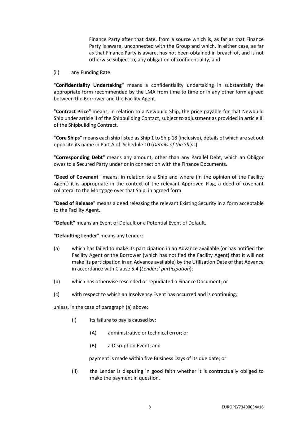 8 EUROPE/73490034v16 Finance Party after that date, from a source which is, as far as that Finance Party is aware, unconnected with the Group and which, in either case, as far as that Finance Party is aware, has not been obtained in breach of, and is not otherwise subject to, any obligation of confidentiality; and (ii) any Funding Rate. "Confidentiality Undertaking" means a confidentiality undertaking in substantially the appropriate form recommended by the LMA from time to time or in any other form agreed between the Borrower and the Facility Agent. "Contract Price" means, in relation to a Newbuild Ship, the price payable for that Newbuild Ship under article II of the Shipbuilding Contact, subject to adjustment as provided in article III of the Shipbuilding Contract. "Core Ships" means each ship listed as Ship 1 to Ship 18 (inclusive), details of which are set out opposite its name in Part A of Schedule 10 (Details of the Ships). "Corresponding Debt" means any amount, other than any Parallel Debt, which an Obligor owes to a Secured Party under or in connection with the Finance Documents. "Deed of Covenant" means, in relation to a Ship and where (in the opinion of the Facility Agent) it is appropriate in the context of the relevant Approved Flag, a deed of covenant collateral to the Mortgage over that Ship, in agreed form. "Deed of Release" means a deed releasing the relevant Existing Security in a form acceptable to the Facility Agent. "Default" means an Event of Default or a Potential Event of Default. "Defaulting Lender" means any Lender: (a) which has failed to make its participation in an Advance available (or has notified the Facility Agent or the Borrower (which has notified the Facility Agent) that it will not make its participation in an Advance available) by the Utilisation Date of that Advance in accordance with Clause 5.4 (Lenders' participation); (b) which has otherwise rescinded or repudiated a Finance Document; or (c) with respect to which an Insolvency Event has occurred and is continuing, unless, in the case of paragraph (a) above: (i) its failure to pay is caused by: (A) administrative or technical error; or (B) a Disruption Event; and payment is made within five Business Days of its due date; or (ii) the Lender is disputing in good faith whether it is contractually obliged to make the payment in question.