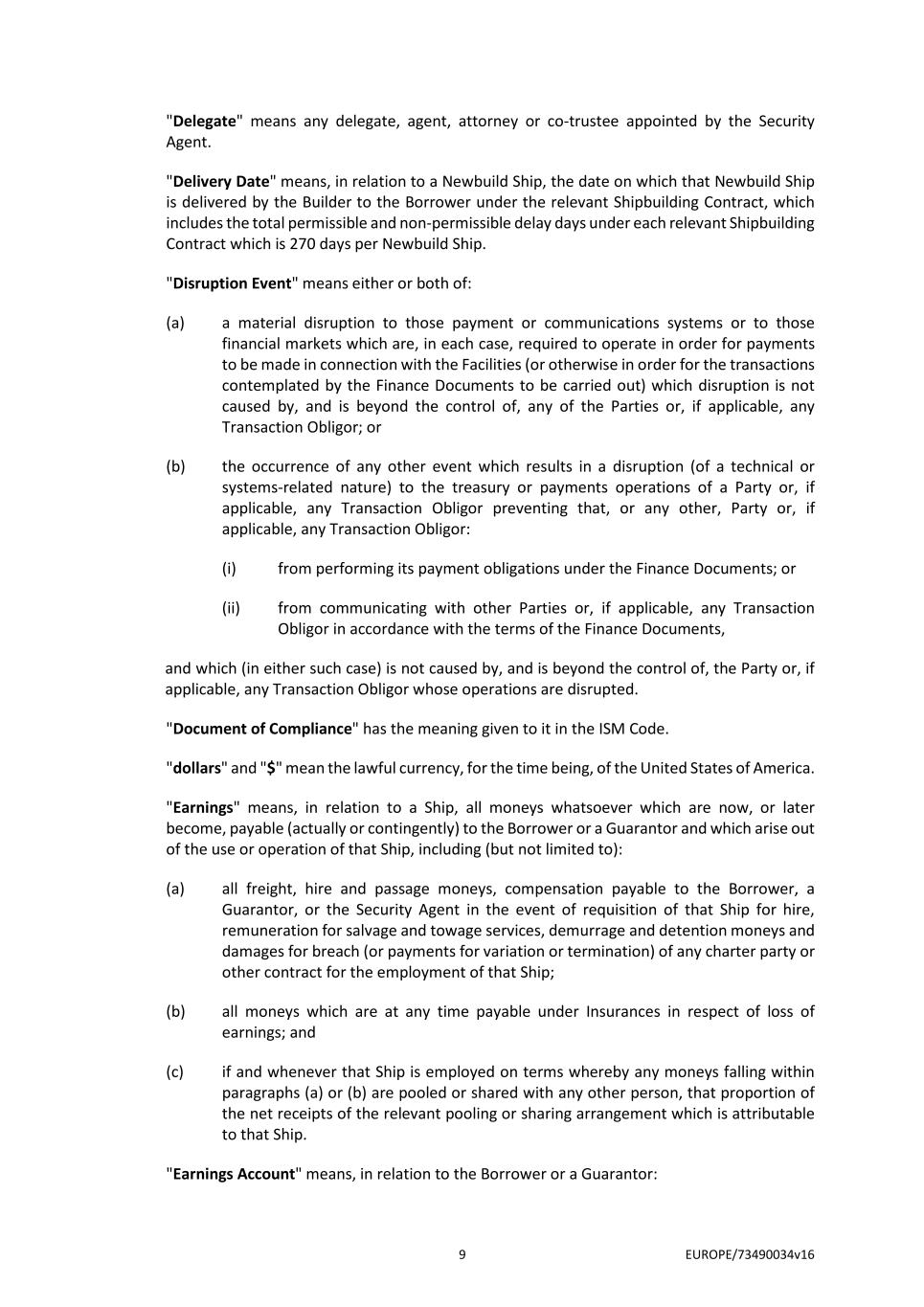 9 EUROPE/73490034v16 "Delegate" means any delegate, agent, attorney or co-trustee appointed by the Security Agent. "Delivery Date" means, in relation to a Newbuild Ship, the date on which that Newbuild Ship is delivered by the Builder to the Borrower under the relevant Shipbuilding Contract, which includes the total permissible and non-permissible delay days under each relevant Shipbuilding Contract which is 270 days per Newbuild Ship. "Disruption Event" means either or both of: (a) a material disruption to those payment or communications systems or to those financial markets which are, in each case, required to operate in order for payments to be made in connection with the Facilities (or otherwise in order for the transactions contemplated by the Finance Documents to be carried out) which disruption is not caused by, and is beyond the control of, any of the Parties or, if applicable, any Transaction Obligor; or (b) the occurrence of any other event which results in a disruption (of a technical or systems-related nature) to the treasury or payments operations of a Party or, if applicable, any Transaction Obligor preventing that, or any other, Party or, if applicable, any Transaction Obligor: (i) from performing its payment obligations under the Finance Documents; or (ii) from communicating with other Parties or, if applicable, any Transaction Obligor in accordance with the terms of the Finance Documents, and which (in either such case) is not caused by, and is beyond the control of, the Party or, if applicable, any Transaction Obligor whose operations are disrupted. "Document of Compliance" has the meaning given to it in the ISM Code. "dollars" and "$" mean the lawful currency, for the time being, of the United States of America. "Earnings" means, in relation to a Ship, all moneys whatsoever which are now, or later become, payable (actually or contingently) to the Borrower or a Guarantor and which arise out of the use or operation of that Ship, including (but not limited to): (a) all freight, hire and passage moneys, compensation payable to the Borrower, a Guarantor, or the Security Agent in the event of requisition of that Ship for hire, remuneration for salvage and towage services, demurrage and detention moneys and damages for breach (or payments for variation or termination) of any charter party or other contract for the employment of that Ship; (b) all moneys which are at any time payable under Insurances in respect of loss of earnings; and (c) if and whenever that Ship is employed on terms whereby any moneys falling within paragraphs (a) or (b) are pooled or shared with any other person, that proportion of the net receipts of the relevant pooling or sharing arrangement which is attributable to that Ship. "Earnings Account" means, in relation to the Borrower or a Guarantor: