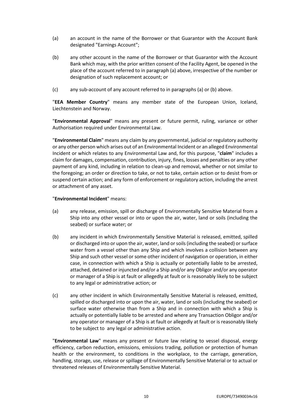 10 EUROPE/73490034v16 (a) an account in the name of the Borrower or that Guarantor with the Account Bank designated "Earnings Account"; (b) any other account in the name of the Borrower or that Guarantor with the Account Bank which may, with the prior written consent of the Facility Agent, be opened in the place of the account referred to in paragraph (a) above, irrespective of the number or designation of such replacement account; or (c) any sub-account of any account referred to in paragraphs (a) or (b) above. "EEA Member Country" means any member state of the European Union, Iceland, Liechtenstein and Norway. "Environmental Approval" means any present or future permit, ruling, variance or other Authorisation required under Environmental Law. "Environmental Claim" means any claim by any governmental, judicial or regulatory authority or any other person which arises out of an Environmental Incident or an alleged Environmental Incident or which relates to any Environmental Law and, for this purpose, "claim" includes a claim for damages, compensation, contribution, injury, fines, losses and penalties or any other payment of any kind, including in relation to clean-up and removal, whether or not similar to the foregoing; an order or direction to take, or not to take, certain action or to desist from or suspend certain action; and any form of enforcement or regulatory action, including the arrest or attachment of any asset. "Environmental Incident" means: (a) any release, emission, spill or discharge of Environmentally Sensitive Material from a Ship into any other vessel or into or upon the air, water, land or soils (including the seabed) or surface water; or (b) any incident in which Environmentally Sensitive Material is released, emitted, spilled or discharged into or upon the air, water, land or soils (including the seabed) or surface water from a vessel other than any Ship and which involves a collision between any Ship and such other vessel or some other incident of navigation or operation, in either case, in connection with which a Ship is actually or potentially liable to be arrested, attached, detained or injuncted and/or a Ship and/or any Obligor and/or any operator or manager of a Ship is at fault or allegedly at fault or is reasonably likely to be subject to any legal or administrative action; or (c) any other incident in which Environmentally Sensitive Material is released, emitted, spilled or discharged into or upon the air, water, land or soils (including the seabed) or surface water otherwise than from a Ship and in connection with which a Ship is actually or potentially liable to be arrested and where any Transaction Obligor and/or any operator or manager of a Ship is at fault or allegedly at fault or is reasonably likely to be subject to any legal or administrative action. "Environmental Law" means any present or future law relating to vessel disposal, energy efficiency, carbon reduction, emissions, emissions trading, pollution or protection of human health or the environment, to conditions in the workplace, to the carriage, generation, handling, storage, use, release or spillage of Environmentally Sensitive Material or to actual or threatened releases of Environmentally Sensitive Material.