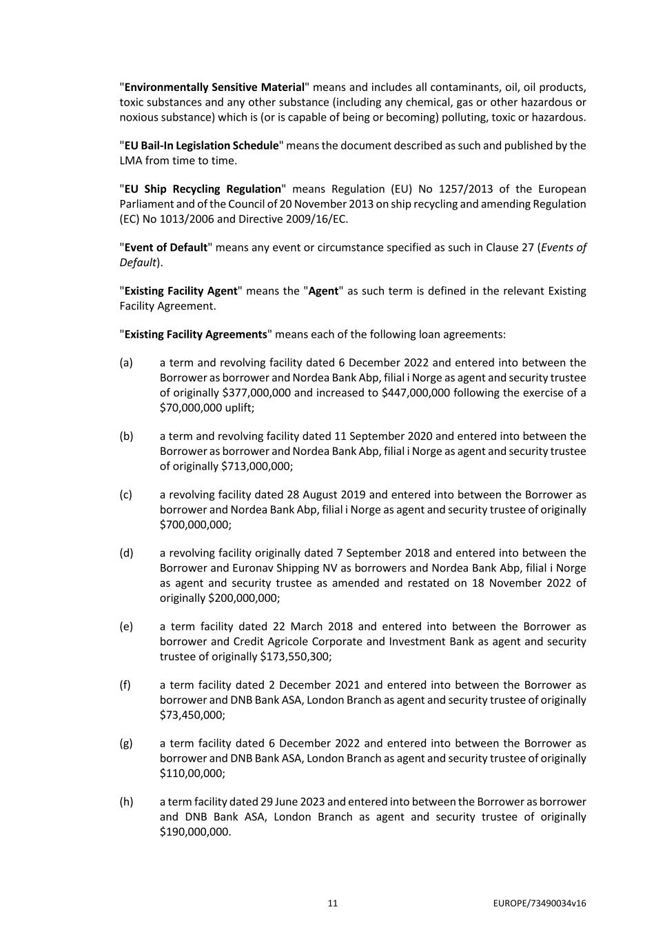 11 EUROPE/73490034v16 "Environmentally Sensitive Material" means and includes all contaminants, oil, oil products, toxic substances and any other substance (including any chemical, gas or other hazardous or noxious substance) which is (or is capable of being or becoming) polluting, toxic or hazardous. "EU Bail-In Legislation Schedule" means the document described as such and published by the LMA from time to time. "EU Ship Recycling Regulation" means Regulation (EU) No 1257/2013 of the European Parliament and of the Council of 20 November 2013 on ship recycling and amending Regulation (EC) No 1013/2006 and Directive 2009/16/EC. "Event of Default" means any event or circumstance specified as such in Clause 27 (Events of Default). "Existing Facility Agent" means the "Agent" as such term is defined in the relevant Existing Facility Agreement. "Existing Facility Agreements" means each of the following loan agreements: (a) a term and revolving facility dated 6 December 2022 and entered into between the Borrower as borrower and Nordea Bank Abp, filial i Norge as agent and security trustee of originally $377,000,000 and increased to $447,000,000 following the exercise of a $70,000,000 uplift; (b) a term and revolving facility dated 11 September 2020 and entered into between the Borrower as borrower and Nordea Bank Abp, filial i Norge as agent and security trustee of originally $713,000,000; (c) a revolving facility dated 28 August 2019 and entered into between the Borrower as borrower and Nordea Bank Abp, filial i Norge as agent and security trustee of originally $700,000,000; (d) a revolving facility originally dated 7 September 2018 and entered into between the Borrower and Euronav Shipping NV as borrowers and Nordea Bank Abp, filial i Norge as agent and security trustee as amended and restated on 18 November 2022 of originally $200,000,000; (e) a term facility dated 22 March 2018 and entered into between the Borrower as borrower and Credit Agricole Corporate and Investment Bank as agent and security trustee of originally $173,550,300; (f) a term facility dated 2 December 2021 and entered into between the Borrower as borrower and DNB Bank ASA, London Branch as agent and security trustee of originally $73,450,000; (g) a term facility dated 6 December 2022 and entered into between the Borrower as borrower and DNB Bank ASA, London Branch as agent and security trustee of originally $110,00,000; (h) a term facility dated 29 June 2023 and entered into between the Borrower as borrower and DNB Bank ASA, London Branch as agent and security trustee of originally $190,000,000.