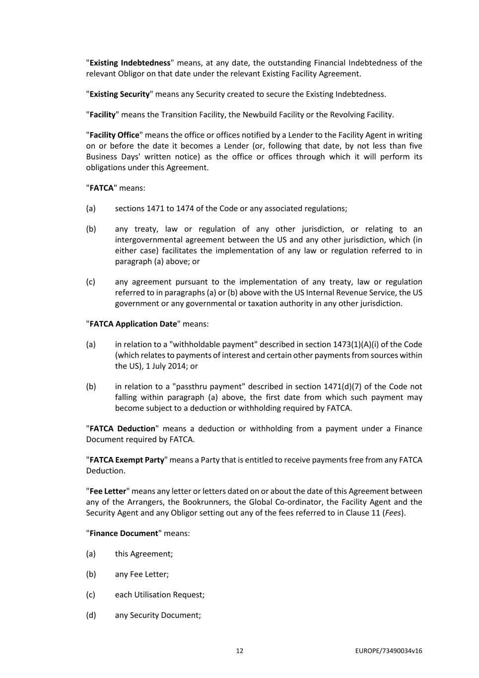 12 EUROPE/73490034v16 "Existing Indebtedness" means, at any date, the outstanding Financial Indebtedness of the relevant Obligor on that date under the relevant Existing Facility Agreement. "Existing Security" means any Security created to secure the Existing Indebtedness. "Facility" means the Transition Facility, the Newbuild Facility or the Revolving Facility. "Facility Office" means the office or offices notified by a Lender to the Facility Agent in writing on or before the date it becomes a Lender (or, following that date, by not less than five Business Days' written notice) as the office or offices through which it will perform its obligations under this Agreement. "FATCA" means: (a) sections 1471 to 1474 of the Code or any associated regulations; (b) any treaty, law or regulation of any other jurisdiction, or relating to an intergovernmental agreement between the US and any other jurisdiction, which (in either case) facilitates the implementation of any law or regulation referred to in paragraph (a) above; or (c) any agreement pursuant to the implementation of any treaty, law or regulation referred to in paragraphs (a) or (b) above with the US Internal Revenue Service, the US government or any governmental or taxation authority in any other jurisdiction. "FATCA Application Date" means: (a) in relation to a "withholdable payment" described in section 1473(1)(A)(i) of the Code (which relates to payments of interest and certain other payments from sources within the US), 1 July 2014; or (b) in relation to a "passthru payment" described in section 1471(d)(7) of the Code not falling within paragraph (a) above, the first date from which such payment may become subject to a deduction or withholding required by FATCA. "FATCA Deduction" means a deduction or withholding from a payment under a Finance Document required by FATCA. "FATCA Exempt Party" means a Party that is entitled to receive payments free from any FATCA Deduction. "Fee Letter" means any letter or letters dated on or about the date of this Agreement between any of the Arrangers, the Bookrunners, the Global Co-ordinator, the Facility Agent and the Security Agent and any Obligor setting out any of the fees referred to in Clause 11 (Fees). "Finance Document" means: (a) this Agreement; (b) any Fee Letter; (c) each Utilisation Request; (d) any Security Document;