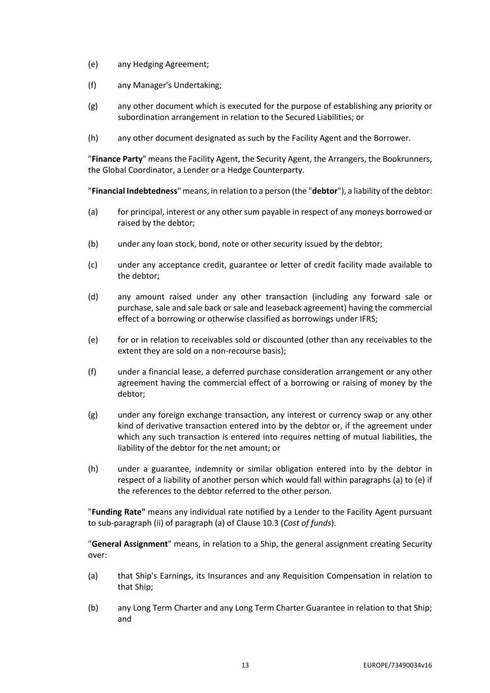 13 EUROPE/73490034v16 (e) any Hedging Agreement; (f) any Manager's Undertaking; (g) any other document which is executed for the purpose of establishing any priority or subordination arrangement in relation to the Secured Liabilities; or (h) any other document designated as such by the Facility Agent and the Borrower. "Finance Party" means the Facility Agent, the Security Agent, the Arrangers, the Bookrunners, the Global Coordinator, a Lender or a Hedge Counterparty. "Financial Indebtedness" means, in relation to a person (the "debtor"), a liability of the debtor: (a) for principal, interest or any other sum payable in respect of any moneys borrowed or raised by the debtor; (b) under any loan stock, bond, note or other security issued by the debtor; (c) under any acceptance credit, guarantee or letter of credit facility made available to the debtor; (d) any amount raised under any other transaction (including any forward sale or purchase, sale and sale back or sale and leaseback agreement) having the commercial effect of a borrowing or otherwise classified as borrowings under IFRS; (e) for or in relation to receivables sold or discounted (other than any receivables to the extent they are sold on a non-recourse basis); (f) under a financial lease, a deferred purchase consideration arrangement or any other agreement having the commercial effect of a borrowing or raising of money by the debtor; (g) under any foreign exchange transaction, any interest or currency swap or any other kind of derivative transaction entered into by the debtor or, if the agreement under which any such transaction is entered into requires netting of mutual liabilities, the liability of the debtor for the net amount; or (h) under a guarantee, indemnity or similar obligation entered into by the debtor in respect of a liability of another person which would fall within paragraphs (a) to (e) if the references to the debtor referred to the other person. "Funding Rate" means any individual rate notified by a Lender to the Facility Agent pursuant to sub-paragraph (ii) of paragraph (a) of Clause 10.3 (Cost of funds). "General Assignment" means, in relation to a Ship, the general assignment creating Security over: (a) that Ship's Earnings, its Insurances and any Requisition Compensation in relation to that Ship; (b) any Long Term Charter and any Long Term Charter Guarantee in relation to that Ship; and