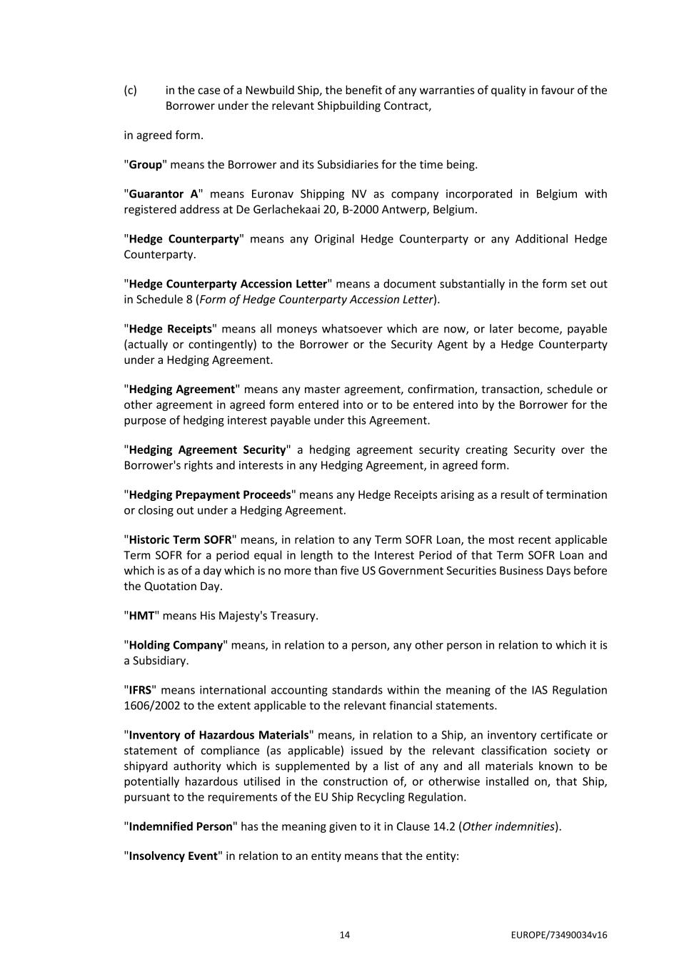 14 EUROPE/73490034v16 (c) in the case of a Newbuild Ship, the benefit of any warranties of quality in favour of the Borrower under the relevant Shipbuilding Contract, in agreed form. "Group" means the Borrower and its Subsidiaries for the time being. "Guarantor A" means Euronav Shipping NV as company incorporated in Belgium with registered address at De Gerlachekaai 20, B-2000 Antwerp, Belgium. "Hedge Counterparty" means any Original Hedge Counterparty or any Additional Hedge Counterparty. "Hedge Counterparty Accession Letter" means a document substantially in the form set out in Schedule 8 (Form of Hedge Counterparty Accession Letter). "Hedge Receipts" means all moneys whatsoever which are now, or later become, payable (actually or contingently) to the Borrower or the Security Agent by a Hedge Counterparty under a Hedging Agreement. "Hedging Agreement" means any master agreement, confirmation, transaction, schedule or other agreement in agreed form entered into or to be entered into by the Borrower for the purpose of hedging interest payable under this Agreement. "Hedging Agreement Security" a hedging agreement security creating Security over the Borrower's rights and interests in any Hedging Agreement, in agreed form. "Hedging Prepayment Proceeds" means any Hedge Receipts arising as a result of termination or closing out under a Hedging Agreement. "Historic Term SOFR" means, in relation to any Term SOFR Loan, the most recent applicable Term SOFR for a period equal in length to the Interest Period of that Term SOFR Loan and which is as of a day which is no more than five US Government Securities Business Days before the Quotation Day. "HMT" means His Majesty's Treasury. "Holding Company" means, in relation to a person, any other person in relation to which it is a Subsidiary. "IFRS" means international accounting standards within the meaning of the IAS Regulation 1606/2002 to the extent applicable to the relevant financial statements. "Inventory of Hazardous Materials" means, in relation to a Ship, an inventory certificate or statement of compliance (as applicable) issued by the relevant classification society or shipyard authority which is supplemented by a list of any and all materials known to be potentially hazardous utilised in the construction of, or otherwise installed on, that Ship, pursuant to the requirements of the EU Ship Recycling Regulation. "Indemnified Person" has the meaning given to it in Clause 14.2 (Other indemnities). "Insolvency Event" in relation to an entity means that the entity: