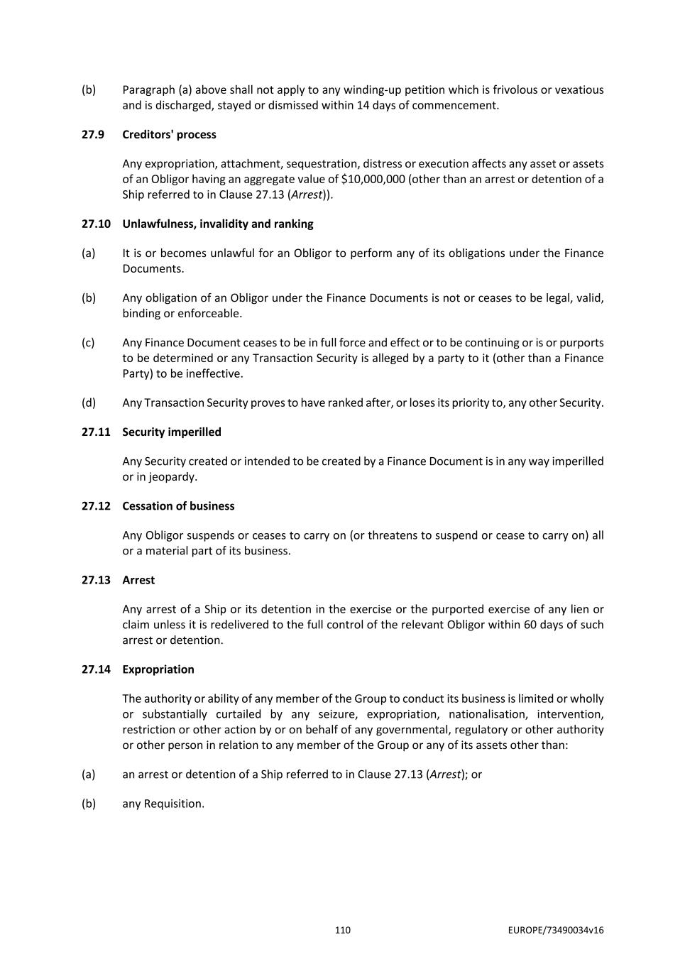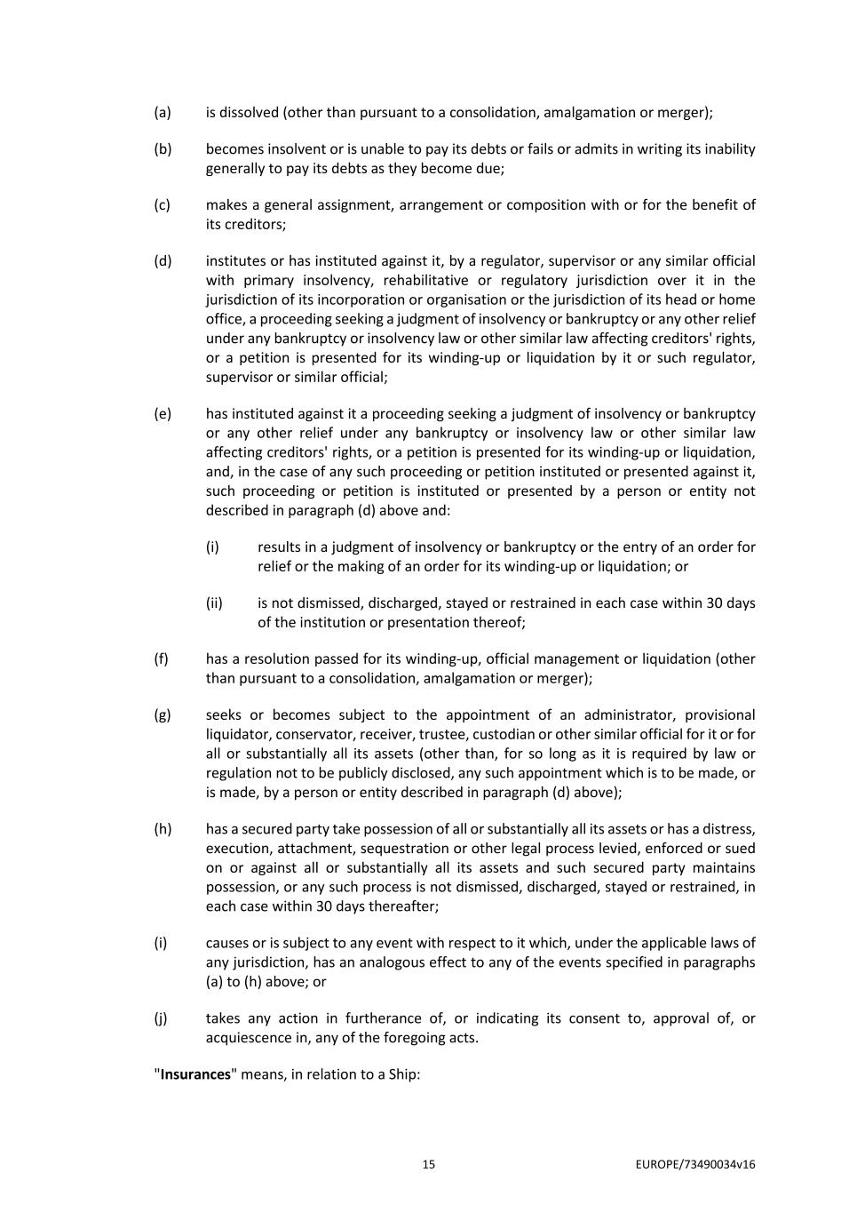 15 EUROPE/73490034v16 (a) is dissolved (other than pursuant to a consolidation, amalgamation or merger); (b) becomes insolvent or is unable to pay its debts or fails or admits in writing its inability generally to pay its debts as they become due; (c) makes a general assignment, arrangement or composition with or for the benefit of its creditors; (d) institutes or has instituted against it, by a regulator, supervisor or any similar official with primary insolvency, rehabilitative or regulatory jurisdiction over it in the jurisdiction of its incorporation or organisation or the jurisdiction of its head or home office, a proceeding seeking a judgment of insolvency or bankruptcy or any other relief under any bankruptcy or insolvency law or other similar law affecting creditors' rights, or a petition is presented for its winding-up or liquidation by it or such regulator, supervisor or similar official; (e) has instituted against it a proceeding seeking a judgment of insolvency or bankruptcy or any other relief under any bankruptcy or insolvency law or other similar law affecting creditors' rights, or a petition is presented for its winding-up or liquidation, and, in the case of any such proceeding or petition instituted or presented against it, such proceeding or petition is instituted or presented by a person or entity not described in paragraph (d) above and: (i) results in a judgment of insolvency or bankruptcy or the entry of an order for relief or the making of an order for its winding-up or liquidation; or (ii) is not dismissed, discharged, stayed or restrained in each case within 30 days of the institution or presentation thereof; (f) has a resolution passed for its winding-up, official management or liquidation (other than pursuant to a consolidation, amalgamation or merger); (g) seeks or becomes subject to the appointment of an administrator, provisional liquidator, conservator, receiver, trustee, custodian or other similar official for it or for all or substantially all its assets (other than, for so long as it is required by law or regulation not to be publicly disclosed, any such appointment which is to be made, or is made, by a person or entity described in paragraph (d) above); (h) has a secured party take possession of all or substantially all its assets or has a distress, execution, attachment, sequestration or other legal process levied, enforced or sued on or against all or substantially all its assets and such secured party maintains possession, or any such process is not dismissed, discharged, stayed or restrained, in each case within 30 days thereafter; (i) causes or is subject to any event with respect to it which, under the applicable laws of any jurisdiction, has an analogous effect to any of the events specified in paragraphs (a) to (h) above; or (j) takes any action in furtherance of, or indicating its consent to, approval of, or acquiescence in, any of the foregoing acts. "Insurances" means, in relation to a Ship:
