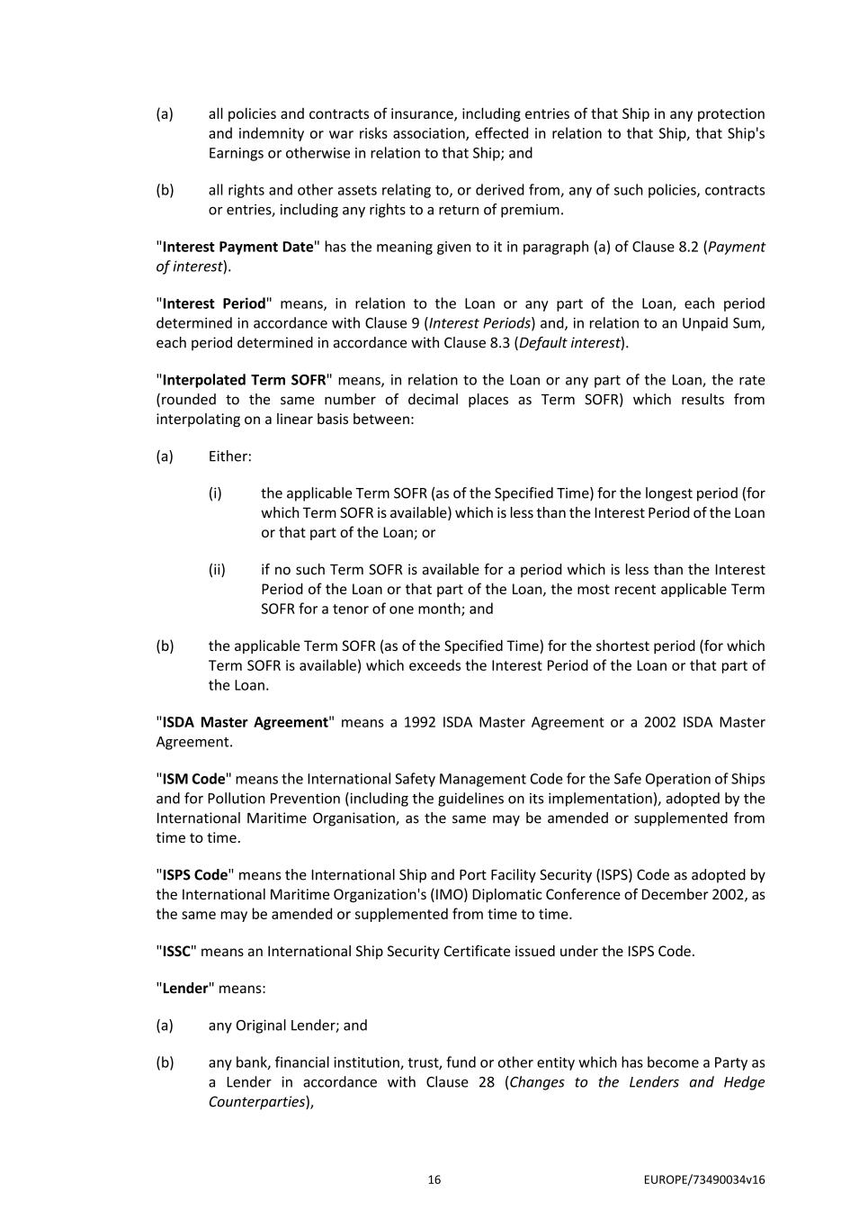 16 EUROPE/73490034v16 (a) all policies and contracts of insurance, including entries of that Ship in any protection and indemnity or war risks association, effected in relation to that Ship, that Ship's Earnings or otherwise in relation to that Ship; and (b) all rights and other assets relating to, or derived from, any of such policies, contracts or entries, including any rights to a return of premium. "Interest Payment Date" has the meaning given to it in paragraph (a) of Clause 8.2 (Payment of interest). "Interest Period" means, in relation to the Loan or any part of the Loan, each period determined in accordance with Clause 9 (Interest Periods) and, in relation to an Unpaid Sum, each period determined in accordance with Clause 8.3 (Default interest). "Interpolated Term SOFR" means, in relation to the Loan or any part of the Loan, the rate (rounded to the same number of decimal places as Term SOFR) which results from interpolating on a linear basis between: (a) Either: (i) the applicable Term SOFR (as of the Specified Time) for the longest period (for which Term SOFR is available) which is less than the Interest Period of the Loan or that part of the Loan; or (ii) if no such Term SOFR is available for a period which is less than the Interest Period of the Loan or that part of the Loan, the most recent applicable Term SOFR for a tenor of one month; and (b) the applicable Term SOFR (as of the Specified Time) for the shortest period (for which Term SOFR is available) which exceeds the Interest Period of the Loan or that part of the Loan. "ISDA Master Agreement" means a 1992 ISDA Master Agreement or a 2002 ISDA Master Agreement. "ISM Code" means the International Safety Management Code for the Safe Operation of Ships and for Pollution Prevention (including the guidelines on its implementation), adopted by the International Maritime Organisation, as the same may be amended or supplemented from time to time. "ISPS Code" means the International Ship and Port Facility Security (ISPS) Code as adopted by the International Maritime Organization's (IMO) Diplomatic Conference of December 2002, as the same may be amended or supplemented from time to time. "ISSC" means an International Ship Security Certificate issued under the ISPS Code. "Lender" means: (a) any Original Lender; and (b) any bank, financial institution, trust, fund or other entity which has become a Party as a Lender in accordance with Clause 28 (Changes to the Lenders and Hedge Counterparties),