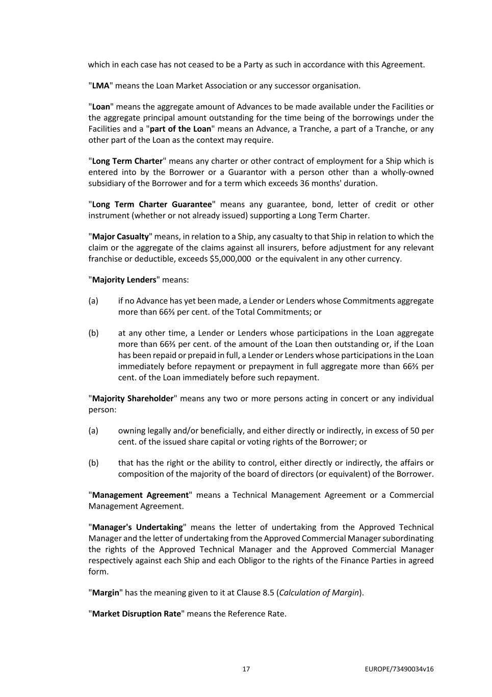 17 EUROPE/73490034v16 which in each case has not ceased to be a Party as such in accordance with this Agreement. "LMA" means the Loan Market Association or any successor organisation. "Loan" means the aggregate amount of Advances to be made available under the Facilities or the aggregate principal amount outstanding for the time being of the borrowings under the Facilities and a "part of the Loan" means an Advance, a Tranche, a part of a Tranche, or any other part of the Loan as the context may require. "Long Term Charter" means any charter or other contract of employment for a Ship which is entered into by the Borrower or a Guarantor with a person other than a wholly-owned subsidiary of the Borrower and for a term which exceeds 36 months' duration. "Long Term Charter Guarantee" means any guarantee, bond, letter of credit or other instrument (whether or not already issued) supporting a Long Term Charter. "Major Casualty" means, in relation to a Ship, any casualty to that Ship in relation to which the claim or the aggregate of the claims against all insurers, before adjustment for any relevant franchise or deductible, exceeds $5,000,000 or the equivalent in any other currency. "Majority Lenders" means: (a) if no Advance has yet been made, a Lender or Lenders whose Commitments aggregate more than 66⅔ per cent. of the Total Commitments; or (b) at any other time, a Lender or Lenders whose participations in the Loan aggregate more than 66⅔ per cent. of the amount of the Loan then outstanding or, if the Loan has been repaid or prepaid in full, a Lender or Lenders whose participations in the Loan immediately before repayment or prepayment in full aggregate more than 66⅔ per cent. of the Loan immediately before such repayment. "Majority Shareholder" means any two or more persons acting in concert or any individual person: (a) owning legally and/or beneficially, and either directly or indirectly, in excess of 50 per cent. of the issued share capital or voting rights of the Borrower; or (b) that has the right or the ability to control, either directly or indirectly, the affairs or composition of the majority of the board of directors (or equivalent) of the Borrower. "Management Agreement" means a Technical Management Agreement or a Commercial Management Agreement. "Manager's Undertaking" means the letter of undertaking from the Approved Technical Manager and the letter of undertaking from the Approved Commercial Manager subordinating the rights of the Approved Technical Manager and the Approved Commercial Manager respectively against each Ship and each Obligor to the rights of the Finance Parties in agreed form. "Margin" has the meaning given to it at Clause 8.5 (Calculation of Margin). "Market Disruption Rate" means the Reference Rate.