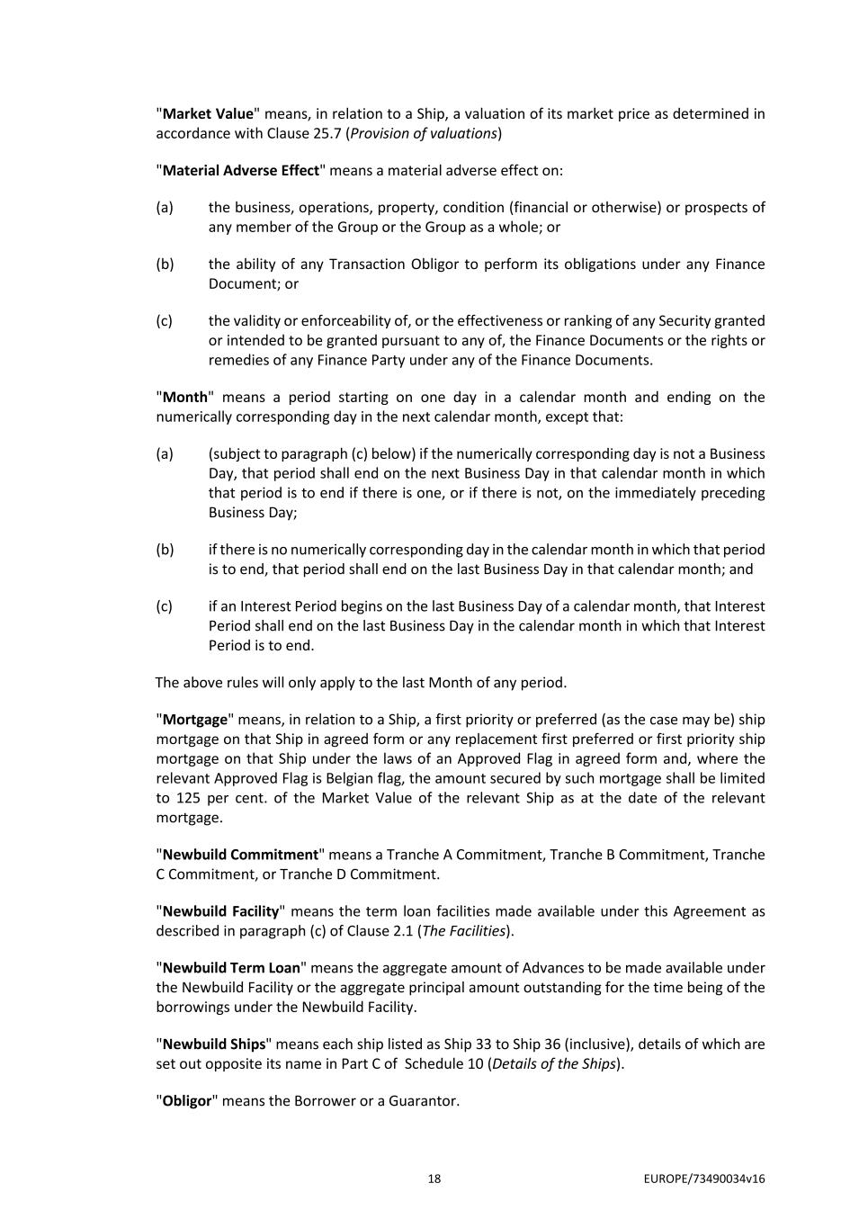 18 EUROPE/73490034v16 "Market Value" means, in relation to a Ship, a valuation of its market price as determined in accordance with Clause 25.7 (Provision of valuations) "Material Adverse Effect" means a material adverse effect on: (a) the business, operations, property, condition (financial or otherwise) or prospects of any member of the Group or the Group as a whole; or (b) the ability of any Transaction Obligor to perform its obligations under any Finance Document; or (c) the validity or enforceability of, or the effectiveness or ranking of any Security granted or intended to be granted pursuant to any of, the Finance Documents or the rights or remedies of any Finance Party under any of the Finance Documents. "Month" means a period starting on one day in a calendar month and ending on the numerically corresponding day in the next calendar month, except that: (a) (subject to paragraph (c) below) if the numerically corresponding day is not a Business Day, that period shall end on the next Business Day in that calendar month in which that period is to end if there is one, or if there is not, on the immediately preceding Business Day; (b) if there is no numerically corresponding day in the calendar month in which that period is to end, that period shall end on the last Business Day in that calendar month; and (c) if an Interest Period begins on the last Business Day of a calendar month, that Interest Period shall end on the last Business Day in the calendar month in which that Interest Period is to end. The above rules will only apply to the last Month of any period. "Mortgage" means, in relation to a Ship, a first priority or preferred (as the case may be) ship mortgage on that Ship in agreed form or any replacement first preferred or first priority ship mortgage on that Ship under the laws of an Approved Flag in agreed form and, where the relevant Approved Flag is Belgian flag, the amount secured by such mortgage shall be limited to 125 per cent. of the Market Value of the relevant Ship as at the date of the relevant mortgage. "Newbuild Commitment" means a Tranche A Commitment, Tranche B Commitment, Tranche C Commitment, or Tranche D Commitment. "Newbuild Facility" means the term loan facilities made available under this Agreement as described in paragraph (c) of Clause 2.1 (The Facilities). "Newbuild Term Loan" means the aggregate amount of Advances to be made available under the Newbuild Facility or the aggregate principal amount outstanding for the time being of the borrowings under the Newbuild Facility. "Newbuild Ships" means each ship listed as Ship 33 to Ship 36 (inclusive), details of which are set out opposite its name in Part C of Schedule 10 (Details of the Ships). "Obligor" means the Borrower or a Guarantor.