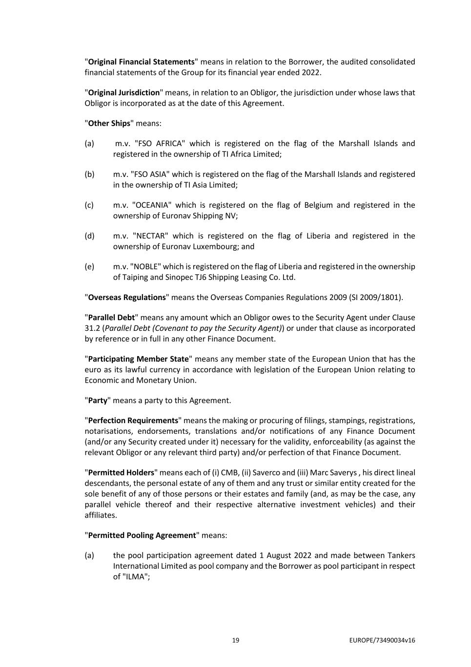 19 EUROPE/73490034v16 "Original Financial Statements" means in relation to the Borrower, the audited consolidated financial statements of the Group for its financial year ended 2022. "Original Jurisdiction" means, in relation to an Obligor, the jurisdiction under whose laws that Obligor is incorporated as at the date of this Agreement. "Other Ships" means: (a) m.v. "FSO AFRICA" which is registered on the flag of the Marshall Islands and registered in the ownership of TI Africa Limited; (b) m.v. "FSO ASIA" which is registered on the flag of the Marshall Islands and registered in the ownership of TI Asia Limited; (c) m.v. "OCEANIA" which is registered on the flag of Belgium and registered in the ownership of Euronav Shipping NV; (d) m.v. "NECTAR" which is registered on the flag of Liberia and registered in the ownership of Euronav Luxembourg; and (e) m.v. "NOBLE" which is registered on the flag of Liberia and registered in the ownership of Taiping and Sinopec TJ6 Shipping Leasing Co. Ltd. "Overseas Regulations" means the Overseas Companies Regulations 2009 (SI 2009/1801). "Parallel Debt" means any amount which an Obligor owes to the Security Agent under Clause 31.2 (Parallel Debt (Covenant to pay the Security Agent)) or under that clause as incorporated by reference or in full in any other Finance Document. "Participating Member State" means any member state of the European Union that has the euro as its lawful currency in accordance with legislation of the European Union relating to Economic and Monetary Union. "Party" means a party to this Agreement. "Perfection Requirements" means the making or procuring of filings, stampings, registrations, notarisations, endorsements, translations and/or notifications of any Finance Document (and/or any Security created under it) necessary for the validity, enforceability (as against the relevant Obligor or any relevant third party) and/or perfection of that Finance Document. "Permitted Holders" means each of (i) CMB, (ii) Saverco and (iii) Marc Saverys , his direct lineal descendants, the personal estate of any of them and any trust or similar entity created for the sole benefit of any of those persons or their estates and family (and, as may be the case, any parallel vehicle thereof and their respective alternative investment vehicles) and their affiliates. "Permitted Pooling Agreement" means: (a) the pool participation agreement dated 1 August 2022 and made between Tankers International Limited as pool company and the Borrower as pool participant in respect of "ILMA";