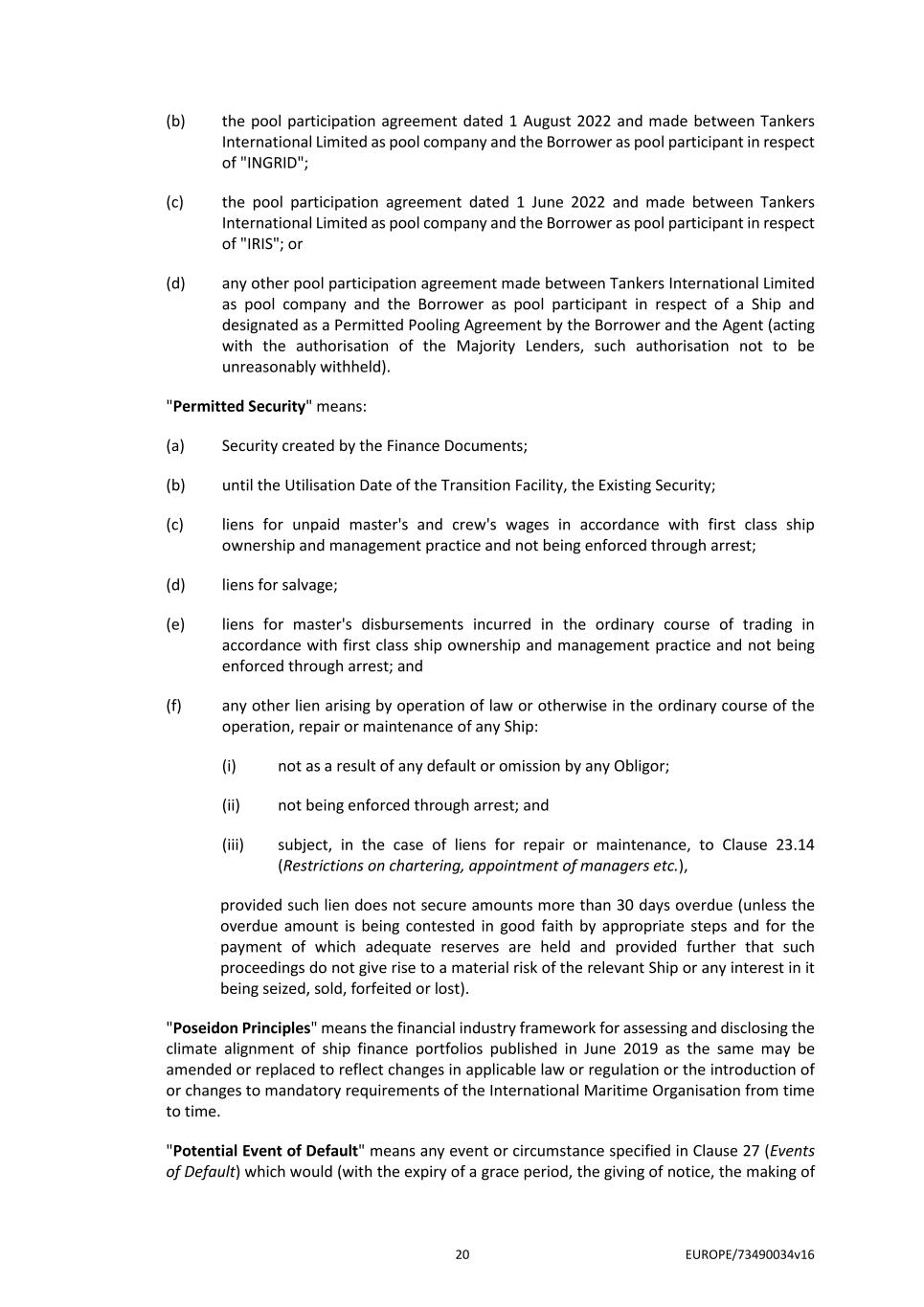20 EUROPE/73490034v16 (b) the pool participation agreement dated 1 August 2022 and made between Tankers International Limited as pool company and the Borrower as pool participant in respect of "INGRID"; (c) the pool participation agreement dated 1 June 2022 and made between Tankers International Limited as pool company and the Borrower as pool participant in respect of "IRIS"; or (d) any other pool participation agreement made between Tankers International Limited as pool company and the Borrower as pool participant in respect of a Ship and designated as a Permitted Pooling Agreement by the Borrower and the Agent (acting with the authorisation of the Majority Lenders, such authorisation not to be unreasonably withheld). "Permitted Security" means: (a) Security created by the Finance Documents; (b) until the Utilisation Date of the Transition Facility, the Existing Security; (c) liens for unpaid master's and crew's wages in accordance with first class ship ownership and management practice and not being enforced through arrest; (d) liens for salvage; (e) liens for master's disbursements incurred in the ordinary course of trading in accordance with first class ship ownership and management practice and not being enforced through arrest; and (f) any other lien arising by operation of law or otherwise in the ordinary course of the operation, repair or maintenance of any Ship: (i) not as a result of any default or omission by any Obligor; (ii) not being enforced through arrest; and (iii) subject, in the case of liens for repair or maintenance, to Clause 23.14 (Restrictions on chartering, appointment of managers etc.), provided such lien does not secure amounts more than 30 days overdue (unless the overdue amount is being contested in good faith by appropriate steps and for the payment of which adequate reserves are held and provided further that such proceedings do not give rise to a material risk of the relevant Ship or any interest in it being seized, sold, forfeited or lost). "Poseidon Principles" means the financial industry framework for assessing and disclosing the climate alignment of ship finance portfolios published in June 2019 as the same may be amended or replaced to reflect changes in applicable law or regulation or the introduction of or changes to mandatory requirements of the International Maritime Organisation from time to time. "Potential Event of Default" means any event or circumstance specified in Clause 27 (Events of Default) which would (with the expiry of a grace period, the giving of notice, the making of