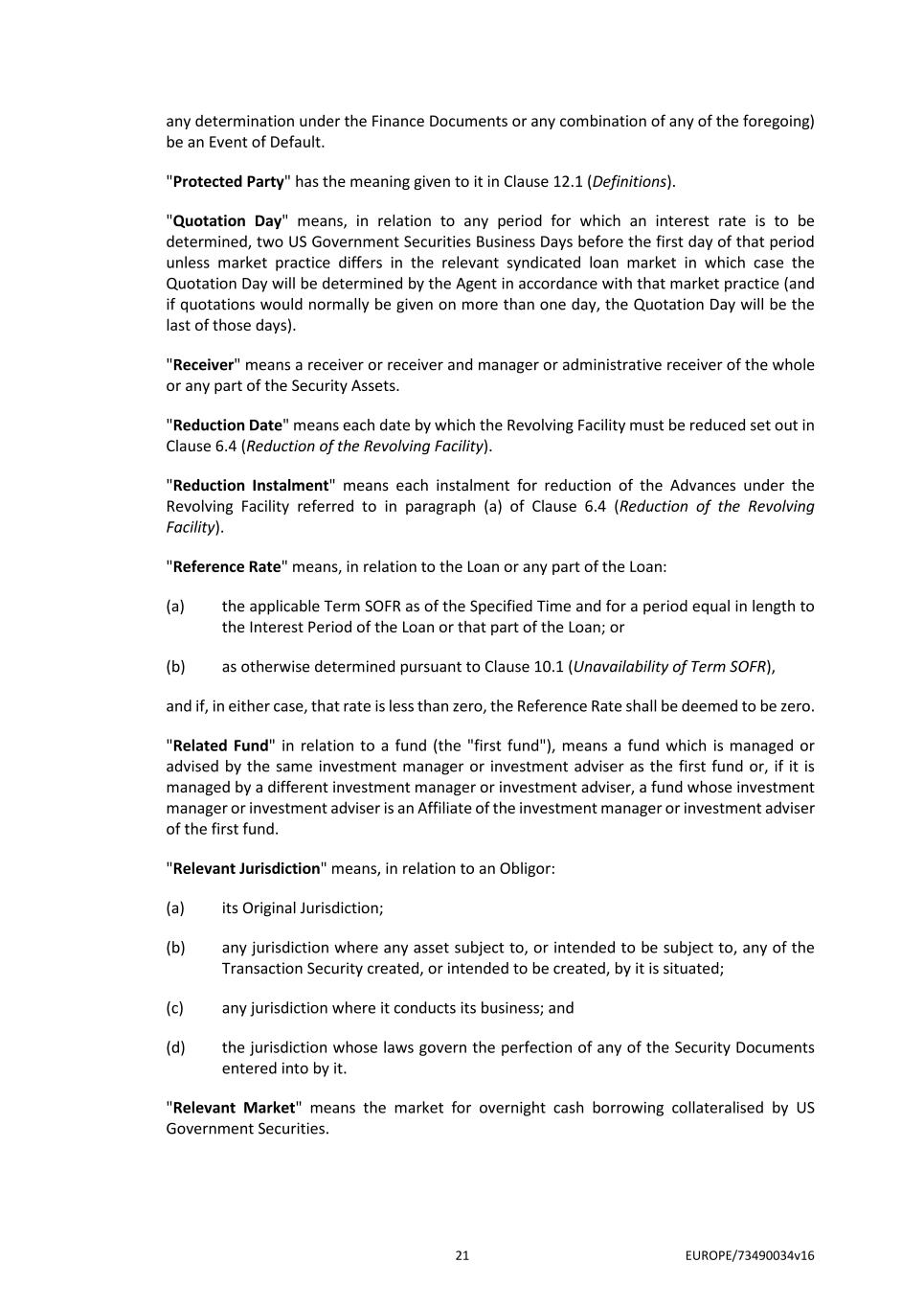 21 EUROPE/73490034v16 any determination under the Finance Documents or any combination of any of the foregoing) be an Event of Default. "Protected Party" has the meaning given to it in Clause 12.1 (Definitions). "Quotation Day" means, in relation to any period for which an interest rate is to be determined, two US Government Securities Business Days before the first day of that period unless market practice differs in the relevant syndicated loan market in which case the Quotation Day will be determined by the Agent in accordance with that market practice (and if quotations would normally be given on more than one day, the Quotation Day will be the last of those days). "Receiver" means a receiver or receiver and manager or administrative receiver of the whole or any part of the Security Assets. "Reduction Date" means each date by which the Revolving Facility must be reduced set out in Clause 6.4 (Reduction of the Revolving Facility). "Reduction Instalment" means each instalment for reduction of the Advances under the Revolving Facility referred to in paragraph (a) of Clause 6.4 (Reduction of the Revolving Facility). "Reference Rate" means, in relation to the Loan or any part of the Loan: (a) the applicable Term SOFR as of the Specified Time and for a period equal in length to the Interest Period of the Loan or that part of the Loan; or (b) as otherwise determined pursuant to Clause 10.1 (Unavailability of Term SOFR), and if, in either case, that rate is less than zero, the Reference Rate shall be deemed to be zero. "Related Fund" in relation to a fund (the "first fund"), means a fund which is managed or advised by the same investment manager or investment adviser as the first fund or, if it is managed by a different investment manager or investment adviser, a fund whose investment manager or investment adviser is an Affiliate of the investment manager or investment adviser of the first fund. "Relevant Jurisdiction" means, in relation to an Obligor: (a) its Original Jurisdiction; (b) any jurisdiction where any asset subject to, or intended to be subject to, any of the Transaction Security created, or intended to be created, by it is situated; (c) any jurisdiction where it conducts its business; and (d) the jurisdiction whose laws govern the perfection of any of the Security Documents entered into by it. "Relevant Market" means the market for overnight cash borrowing collateralised by US Government Securities.