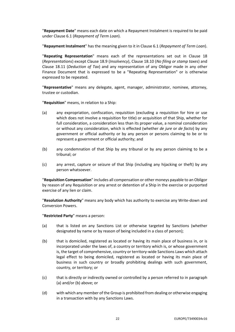 22 EUROPE/73490034v16 "Repayment Date" means each date on which a Repayment Instalment is required to be paid under Clause 6.1 (Repayment of Term Loan). "Repayment Instalment" has the meaning given to it in Clause 6.1 (Repayment of Term Loan). "Repeating Representation" means each of the representations set out in Clause 18 (Representations) except Clause 18.9 (Insolvency), Clause 18.10 (No filing or stamp taxes) and Clause 18.11 (Deduction of Tax) and any representation of any Obligor made in any other Finance Document that is expressed to be a "Repeating Representation" or is otherwise expressed to be repeated. "Representative" means any delegate, agent, manager, administrator, nominee, attorney, trustee or custodian. "Requisition" means, in relation to a Ship: (a) any expropriation, confiscation, requisition (excluding a requisition for hire or use which does not involve a requisition for title) or acquisition of that Ship, whether for full consideration, a consideration less than its proper value, a nominal consideration or without any consideration, which is effected (whether de jure or de facto) by any government or official authority or by any person or persons claiming to be or to represent a government or official authority; and (b) any condemnation of that Ship by any tribunal or by any person claiming to be a tribunal; or (c) any arrest, capture or seizure of that Ship (including any hijacking or theft) by any person whatsoever. "Requisition Compensation" includes all compensation or other moneys payable to an Obligor by reason of any Requisition or any arrest or detention of a Ship in the exercise or purported exercise of any lien or claim. "Resolution Authority" means any body which has authority to exercise any Write-down and Conversion Powers. "Restricted Party" means a person: (a) that is listed on any Sanctions List or otherwise targeted by Sanctions (whether designated by name or by reason of being included in a class of person); (b) that is domiciled, registered as located or having its main place of business in, or is incorporated under the laws of, a country or territory which is, or whose government is, the target of comprehensive, country or territory-wide Sanctions Laws which attach legal effect to being domiciled, registered as located or having its main place of business in such country or broadly prohibiting dealings with such government, country, or territory; or (c) that is directly or indirectly owned or controlled by a person referred to in paragraph (a) and/or (b) above; or (d) with which any member of the Group is prohibited from dealing or otherwise engaging in a transaction with by any Sanctions Laws.