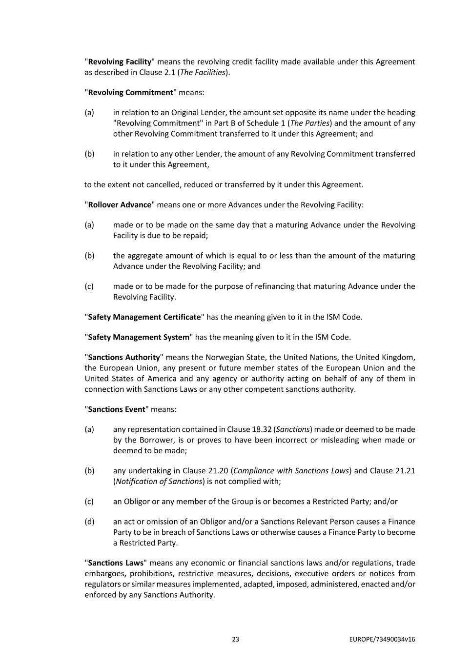 23 EUROPE/73490034v16 "Revolving Facility" means the revolving credit facility made available under this Agreement as described in Clause 2.1 (The Facilities). "Revolving Commitment" means: (a) in relation to an Original Lender, the amount set opposite its name under the heading "Revolving Commitment" in Part B of Schedule 1 (The Parties) and the amount of any other Revolving Commitment transferred to it under this Agreement; and (b) in relation to any other Lender, the amount of any Revolving Commitment transferred to it under this Agreement, to the extent not cancelled, reduced or transferred by it under this Agreement. "Rollover Advance" means one or more Advances under the Revolving Facility: (a) made or to be made on the same day that a maturing Advance under the Revolving Facility is due to be repaid; (b) the aggregate amount of which is equal to or less than the amount of the maturing Advance under the Revolving Facility; and (c) made or to be made for the purpose of refinancing that maturing Advance under the Revolving Facility. "Safety Management Certificate" has the meaning given to it in the ISM Code. "Safety Management System" has the meaning given to it in the ISM Code. "Sanctions Authority" means the Norwegian State, the United Nations, the United Kingdom, the European Union, any present or future member states of the European Union and the United States of America and any agency or authority acting on behalf of any of them in connection with Sanctions Laws or any other competent sanctions authority. "Sanctions Event" means: (a) any representation contained in Clause 18.32 (Sanctions) made or deemed to be made by the Borrower, is or proves to have been incorrect or misleading when made or deemed to be made; (b) any undertaking in Clause 21.20 (Compliance with Sanctions Laws) and Clause 21.21 (Notification of Sanctions) is not complied with; (c) an Obligor or any member of the Group is or becomes a Restricted Party; and/or (d) an act or omission of an Obligor and/or a Sanctions Relevant Person causes a Finance Party to be in breach of Sanctions Laws or otherwise causes a Finance Party to become a Restricted Party. "Sanctions Laws" means any economic or financial sanctions laws and/or regulations, trade embargoes, prohibitions, restrictive measures, decisions, executive orders or notices from regulators or similar measures implemented, adapted, imposed, administered, enacted and/or enforced by any Sanctions Authority.
