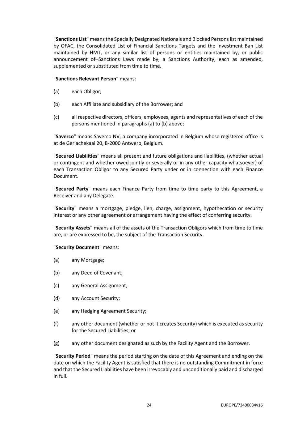 24 EUROPE/73490034v16 "Sanctions List" means the Specially Designated Nationals and Blocked Persons list maintained by OFAC, the Consolidated List of Financial Sanctions Targets and the Investment Ban List maintained by HMT, or any similar list of persons or entities maintained by, or public announcement of Sanctions Laws made by, a Sanctions Authority, each as amended, supplemented or substituted from time to time. "Sanctions Relevant Person" means: (a) each Obligor; (b) each Affiliate and subsidiary of the Borrower; and (c) all respective directors, officers, employees, agents and representatives of each of the persons mentioned in paragraphs (a) to (b) above; "Saverco" means Saverco NV, a company incorporated in Belgium whose registered office is at de Gerlachekaai 20, B-2000 Antwerp, Belgium. "Secured Liabilities" means all present and future obligations and liabilities, (whether actual or contingent and whether owed jointly or severally or in any other capacity whatsoever) of each Transaction Obligor to any Secured Party under or in connection with each Finance Document. "Secured Party" means each Finance Party from time to time party to this Agreement, a Receiver and any Delegate. "Security" means a mortgage, pledge, lien, charge, assignment, hypothecation or security interest or any other agreement or arrangement having the effect of conferring security. "Security Assets" means all of the assets of the Transaction Obligors which from time to time are, or are expressed to be, the subject of the Transaction Security. "Security Document" means: (a) any Mortgage; (b) any Deed of Covenant; (c) any General Assignment; (d) any Account Security; (e) any Hedging Agreement Security; (f) any other document (whether or not it creates Security) which is executed as security for the Secured Liabilities; or (g) any other document designated as such by the Facility Agent and the Borrower. "Security Period" means the period starting on the date of this Agreement and ending on the date on which the Facility Agent is satisfied that there is no outstanding Commitment in force and that the Secured Liabilities have been irrevocably and unconditionally paid and discharged in full.